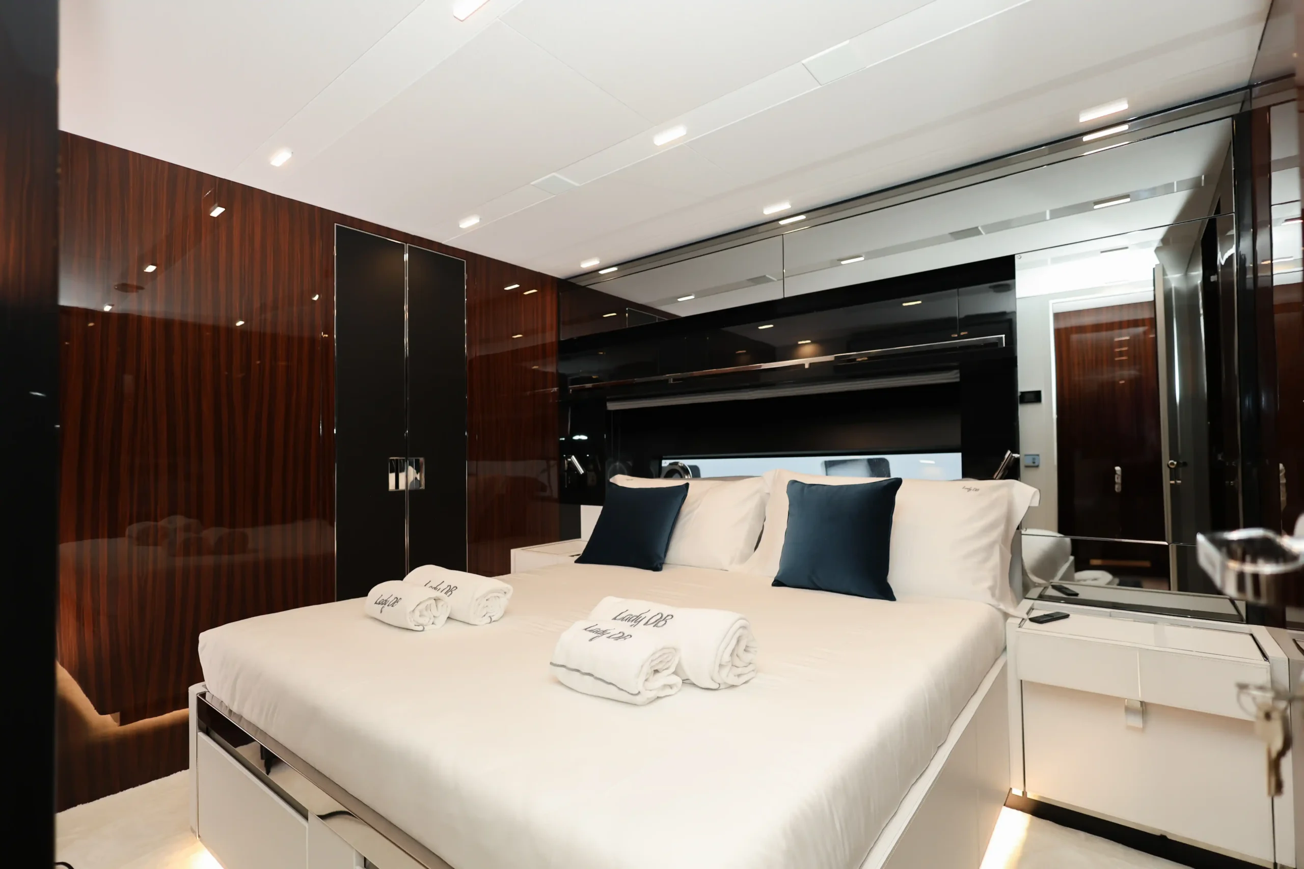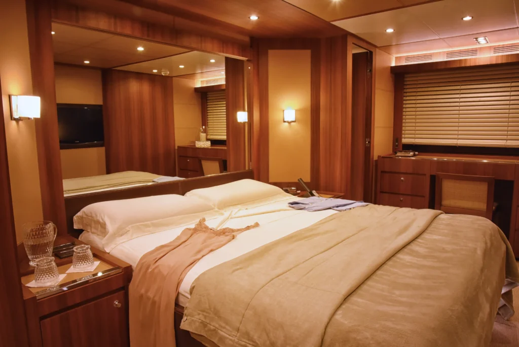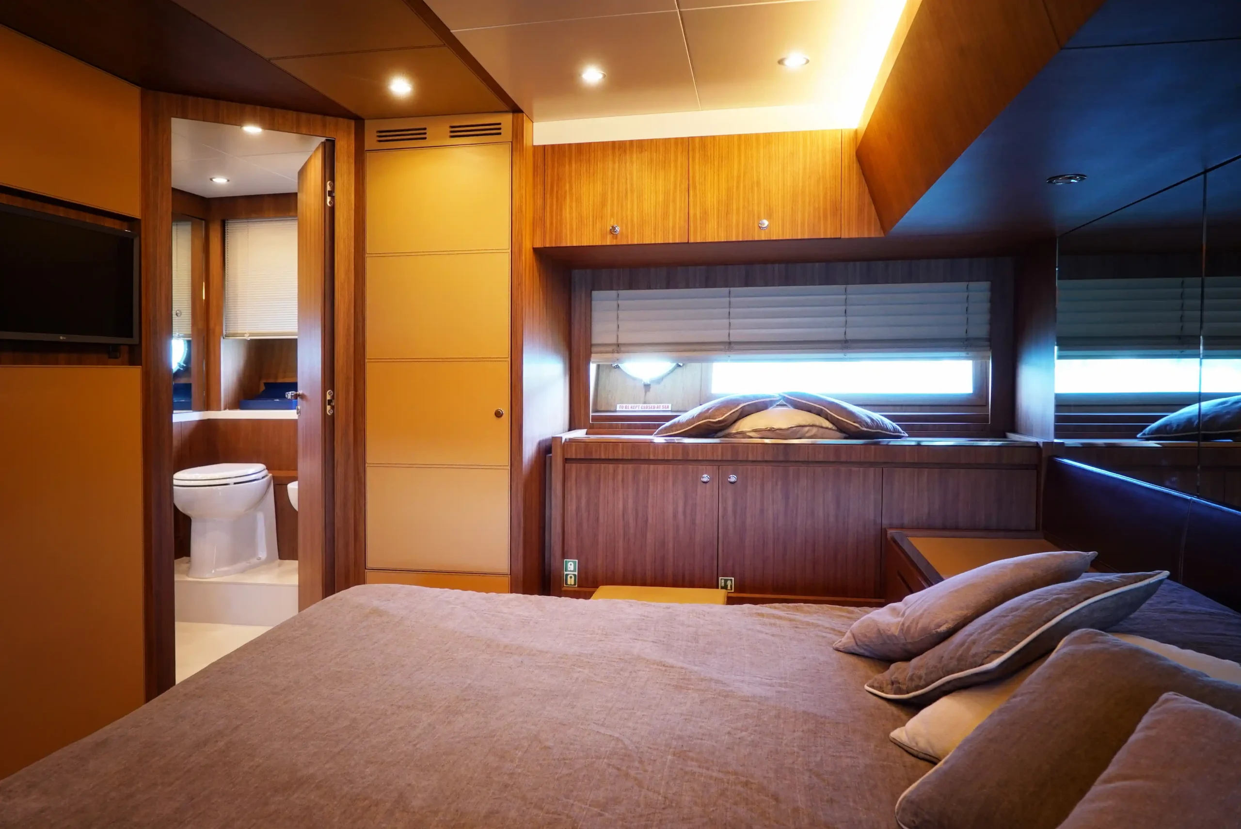 La zona notte offre una spaziosa suite matrimoniale a centro barca con TV LED LCD da 32 pollici, una doppia suite VIP a prua con TV LED LCD da 22 pollici e una cabina doppia con letti singoli separati. Ogni cabina è dotata di bagno privato con box doccia e WC separati.