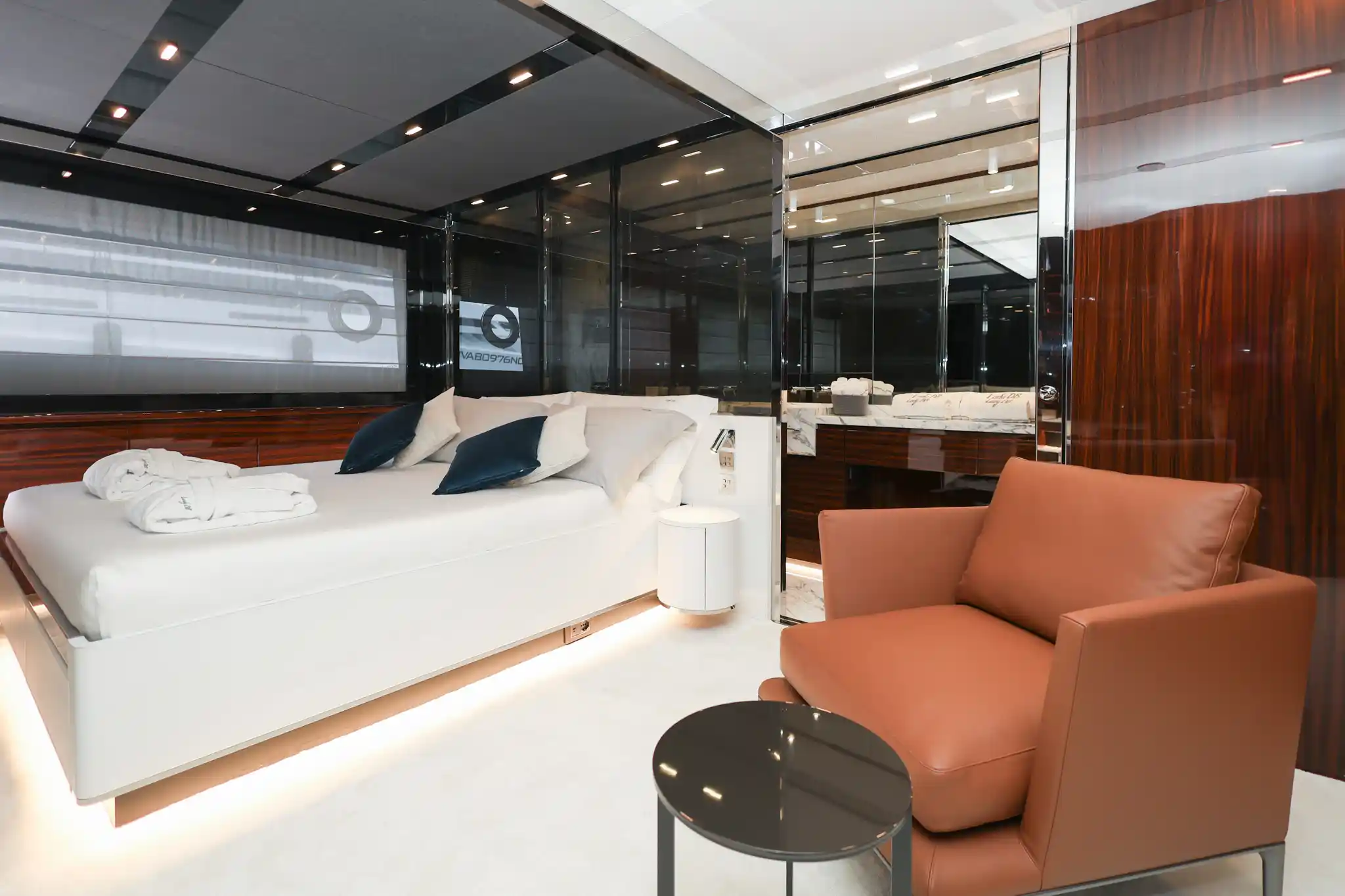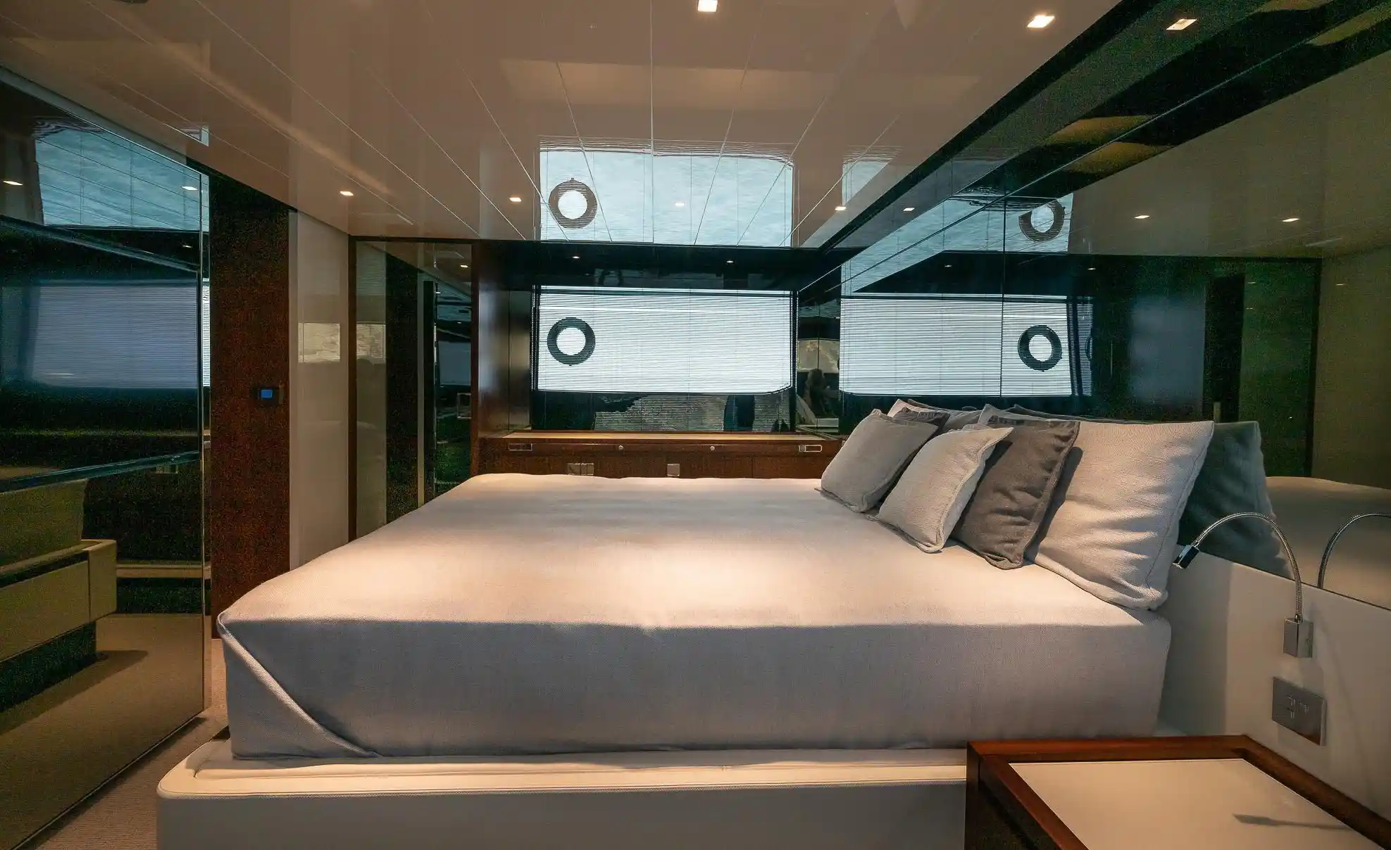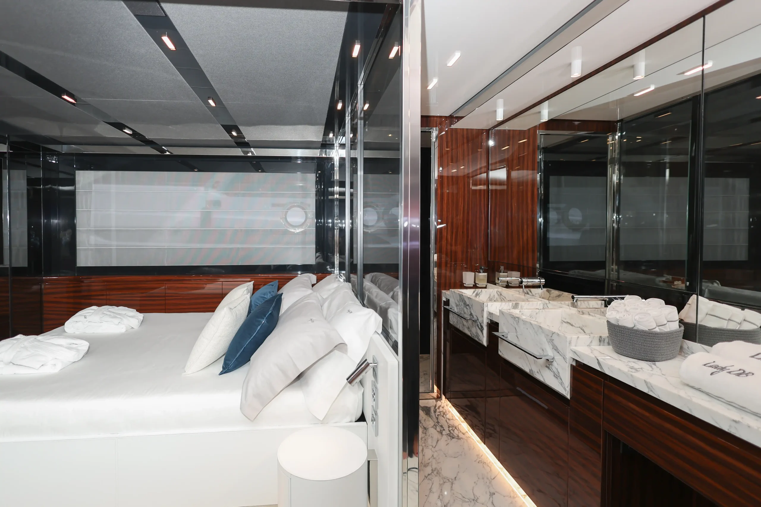 La zona notte offre una spaziosa suite matrimoniale a centro barca con TV LED LCD da 32 pollici, una doppia suite VIP a prua con TV LED LCD da 22 pollici e una cabina doppia con letti singoli separati. Ogni cabina è dotata di bagno privato con box doccia e WC separati.