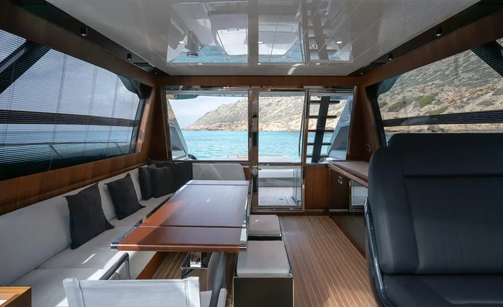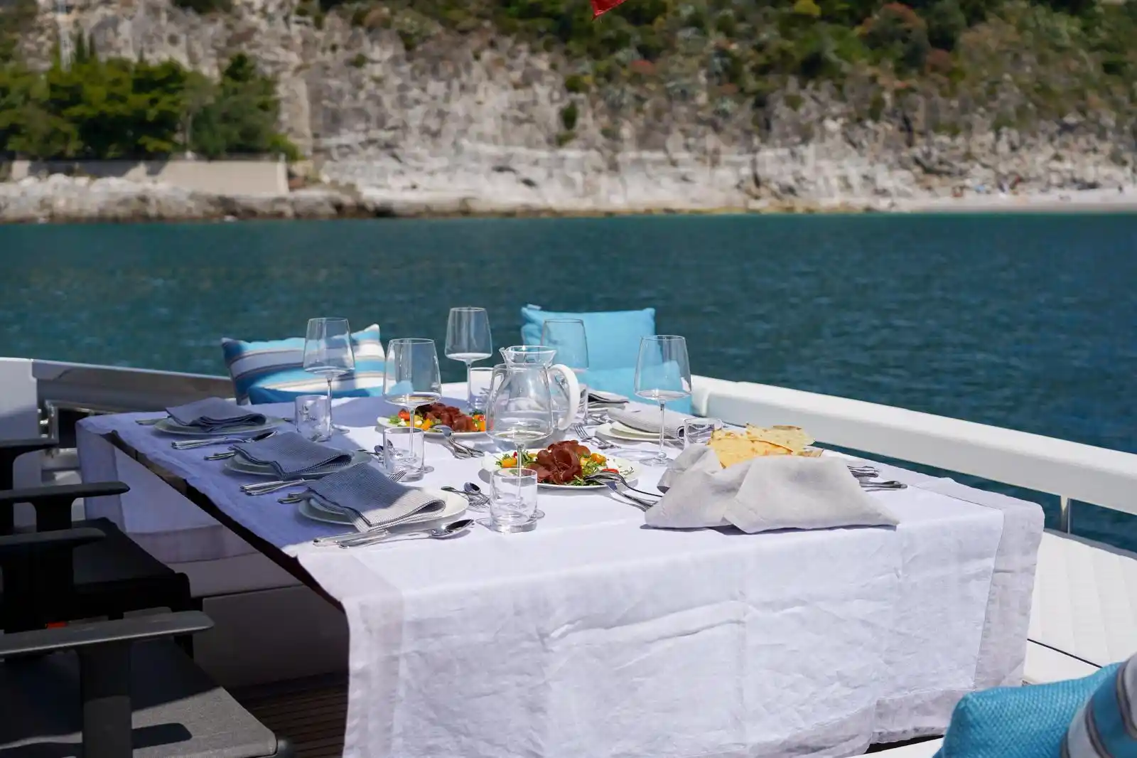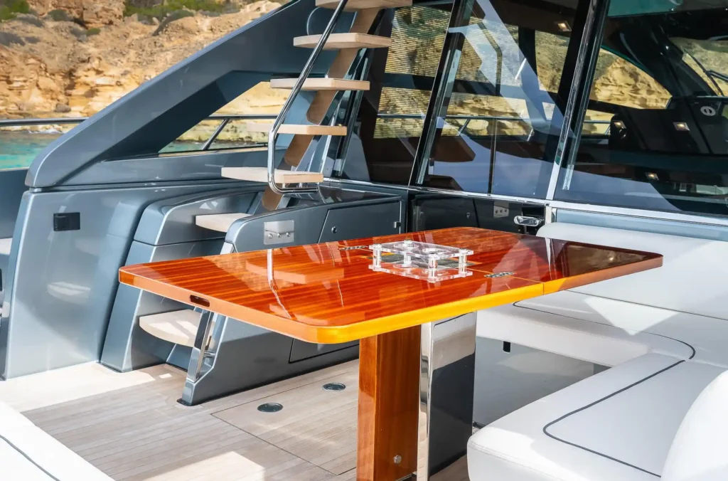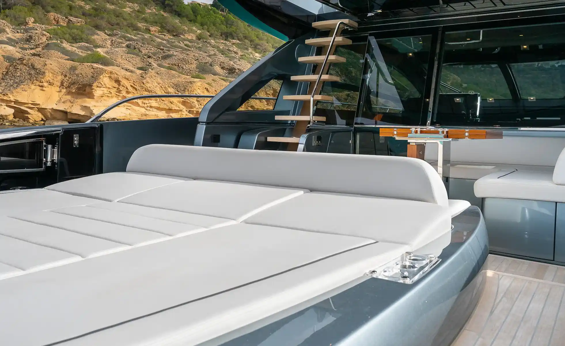 Le enormi aree prendisole a prua e a poppa offrono un comodo prendisole. C’è anche un ampio pozzetto con tavolo da pranzo per mangiare all’aperto. Sul ponte superiore troviamo una splendida area lounge privata con tavolo da pranzo e divani.