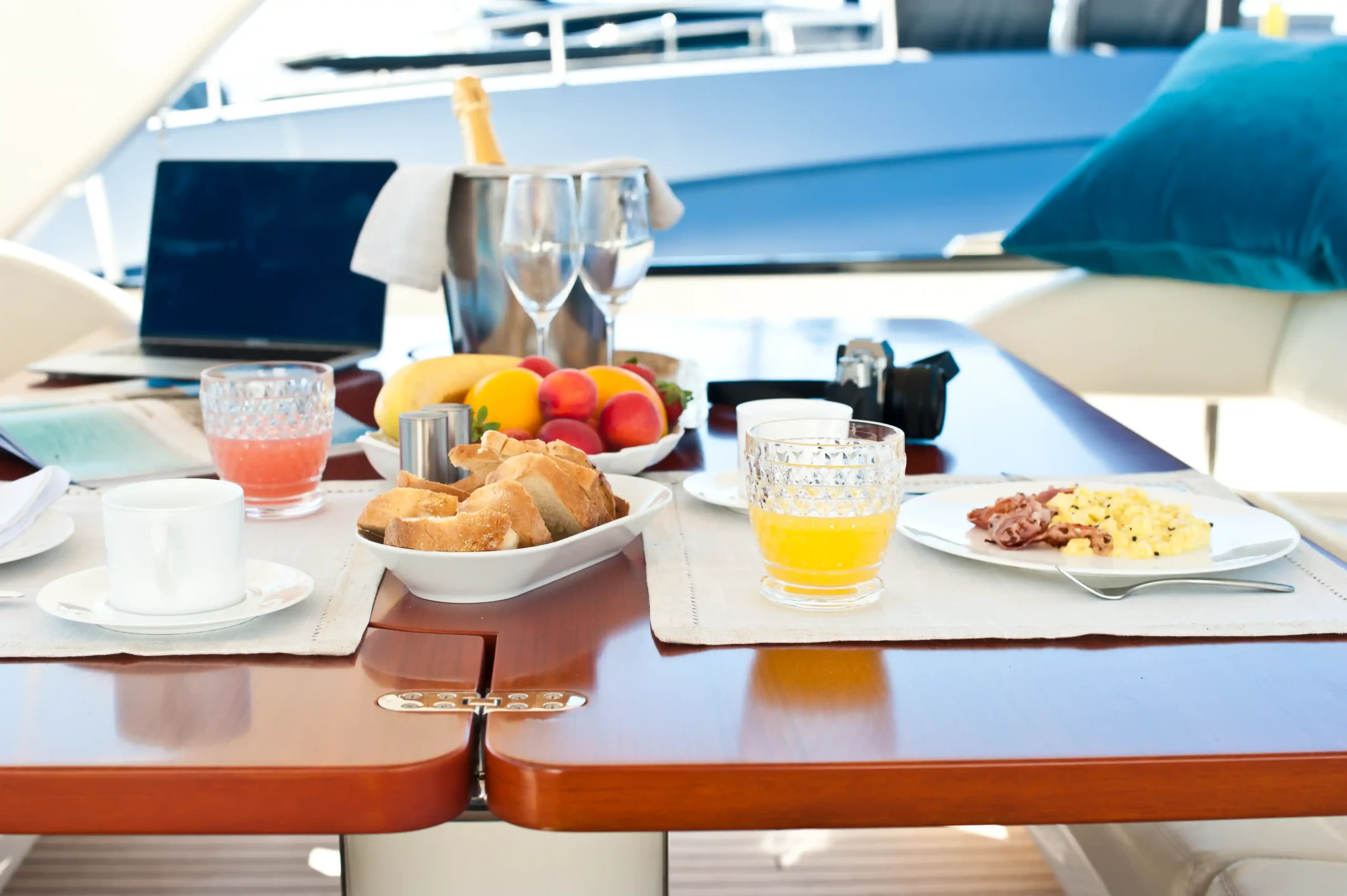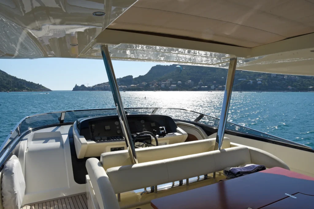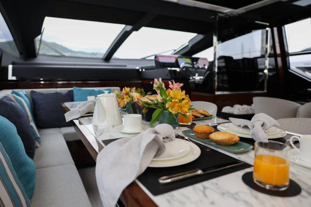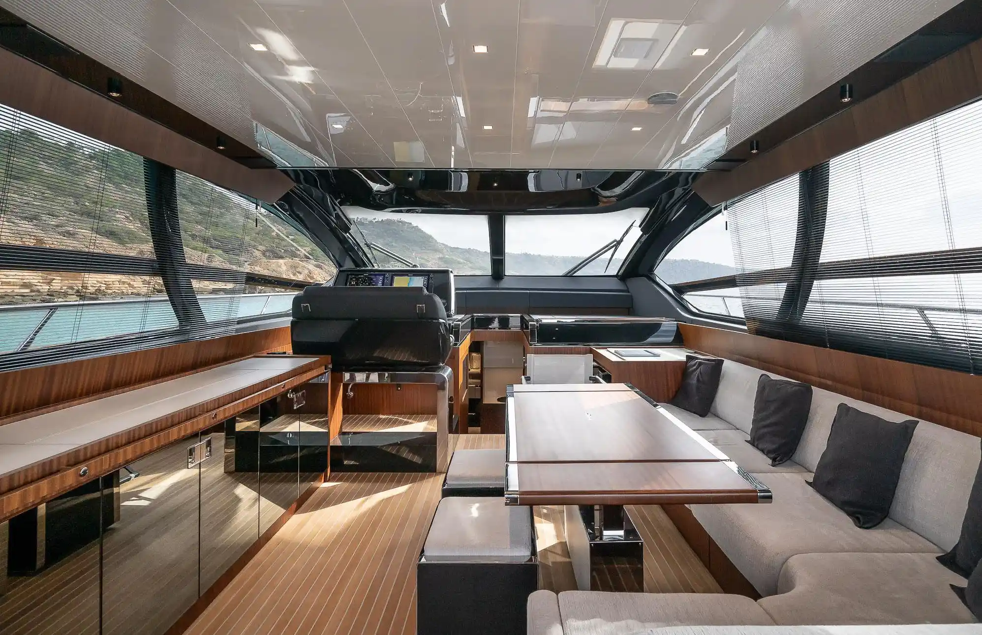 Le enormi aree prendisole a prua e a poppa offrono un comodo prendisole. C’è anche un ampio pozzetto con tavolo da pranzo per mangiare all’aperto. Sul ponte superiore troviamo una splendida area lounge privata con tavolo da pranzo e divani.