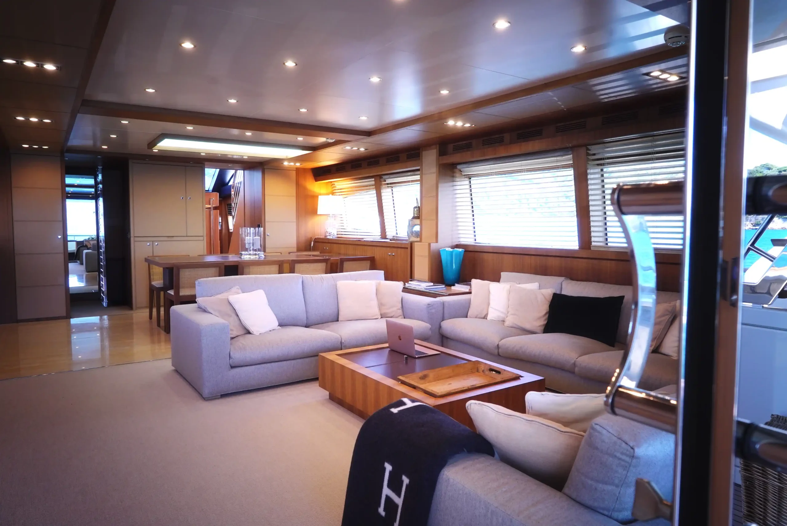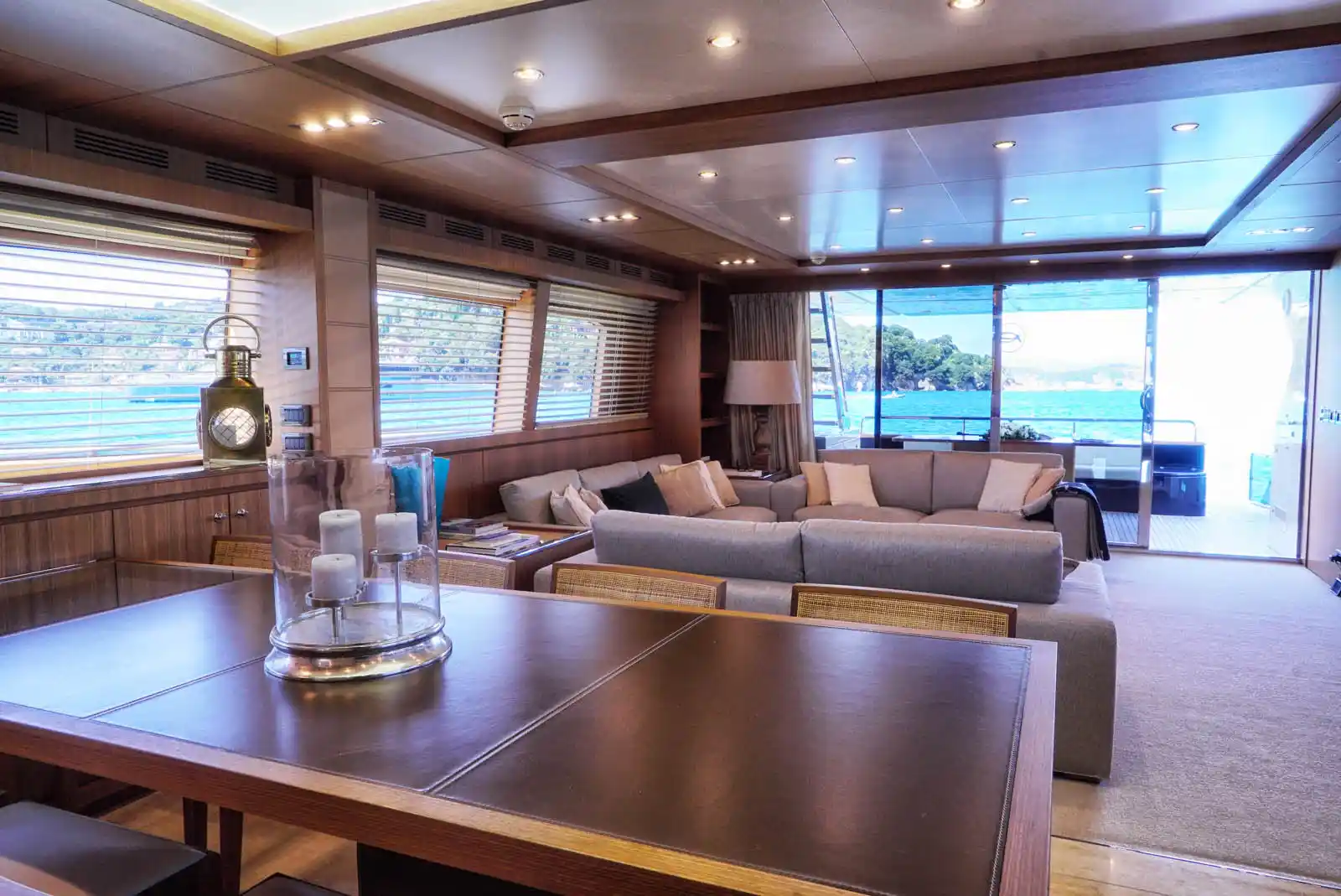 Interni eleganti e raffinati, ampio salone con comodi divani, cucina ben attrezzata e zona pranzo separata. Sottocoperta a centro barca si trova una suite armatoriale matrimoniale a tutto baglio, a prua una cabina VIP doppia mentre a babordo e dritta troviamo 2 cabine doppie con letti singoli separati. Tutte dotate di bagno privato.