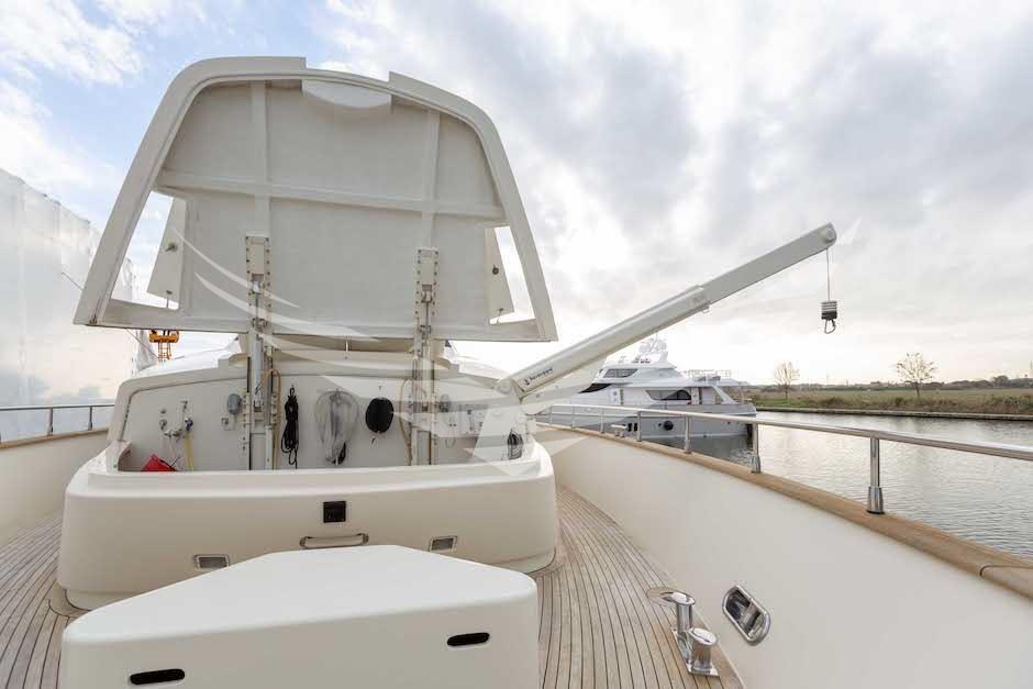 Allestimento tecnico e di coperta Allarme fumo/gas, Allarme motore, Allarme sentina, 2 Ancora (Acciaio), 2 Autoclave, 2 Autogonfiabile, Batterie, Bocche di Lupa, Colorazione speciale (Blu scafo e sovrastruttura beage), Doppia timoneria, Elica di poppa – stern thruster (Idraulica), Elica di prua – bow thruster (Idraulica), Fari fissi a poppa, Faro orientabile, Flap idraulici, Garage per tender (Tender da 4,20), Gruette per moto d’acqua (A prora), Impianto antincendio, Indicatori Flaps, Lavaggio catena, Luci di cortesia, Luci subacquee, Moto d’acqua (Seadu 64JF Spark2ap900HO/IBR W GB 18 CE), Passerella (a scomparsa idraulica), Piattaforma (Abbattibile), Pompa di sentina automatica, Porta ingresso, Porta laterale, Presa 220V banchina, Presa acqua banchina, Raddrizzatore, Ripetitore strumentazione (Tramite Naviop), Rollbar, Scala reale, Selle per Tender (Slitta in Acciaio), Sistema Depurazione acque nere, 4 Stabilizzatori (ARG Mitsubishi), Tavolo Salone Abbattibile (Fisso), Tender (Aquascann F 14 MT 420), Tientibene con cancelletti, Tromba, T-Top, 2 Winch tonneggio di poppa, 2 Winch tonneggio di prua.
