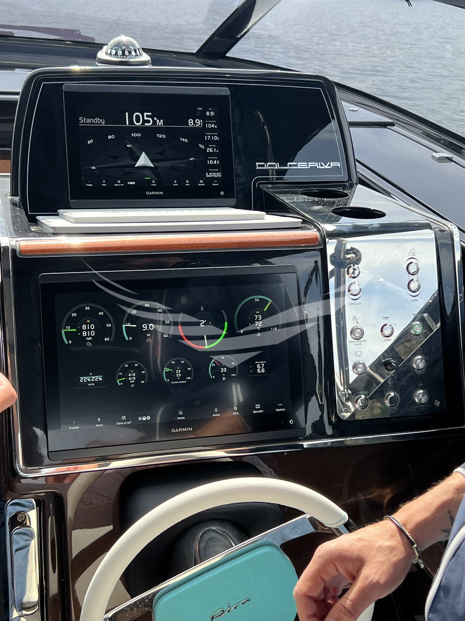 AIS (RICEVENTE E TRASMITTENTE), Angolo barra, Bussola, Comando motori elettronico, Computer di bordo, Display, Ecoscandaglio, GPS, Joystick, Log, Pilota automatico, Plotter con antenna GPS, Radio VHF, Sedile Copilota.