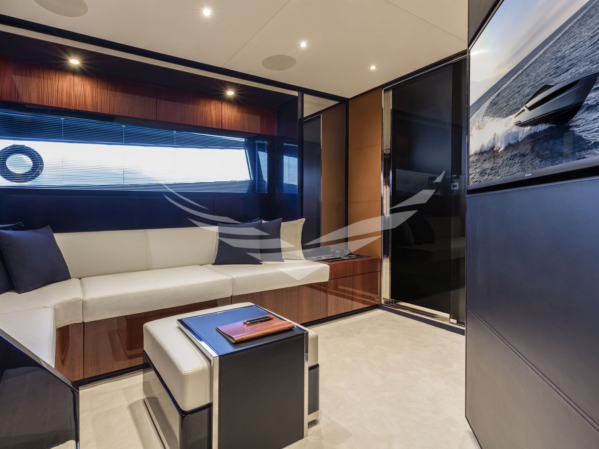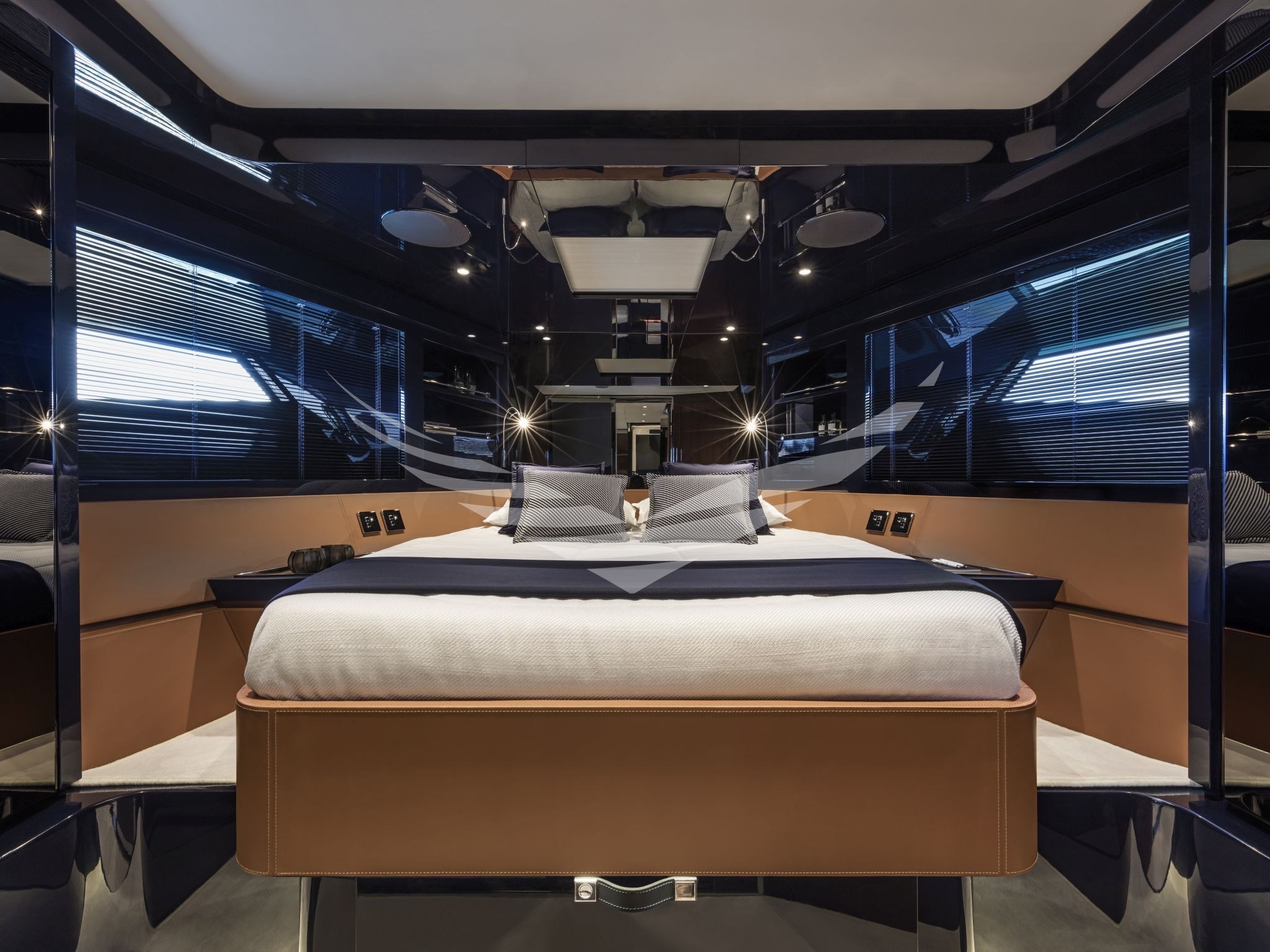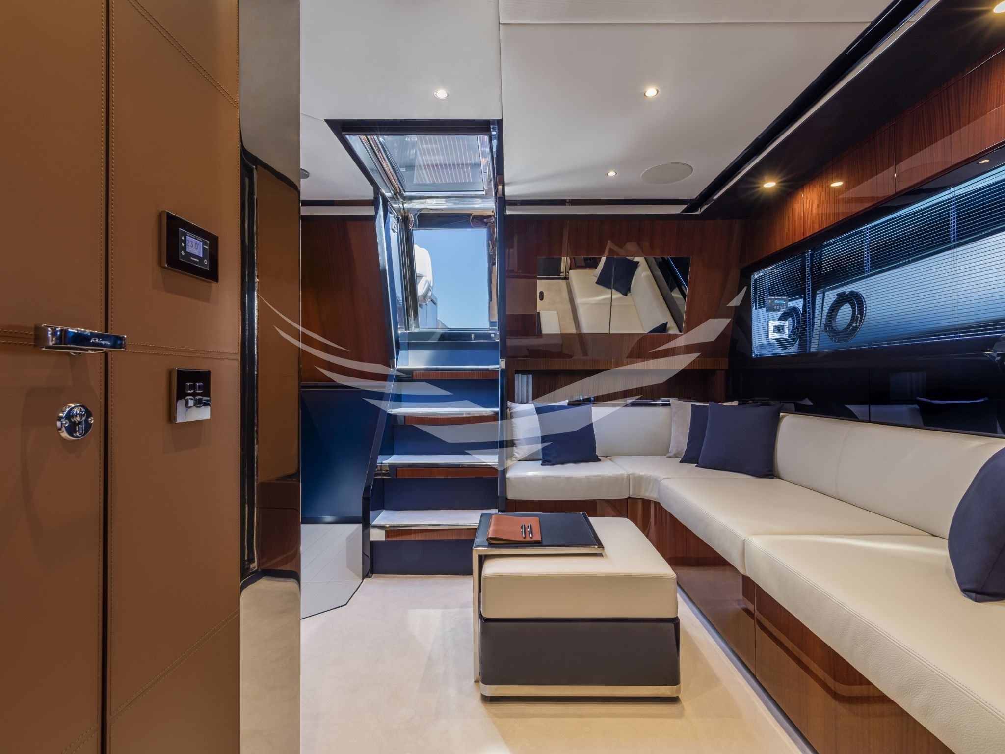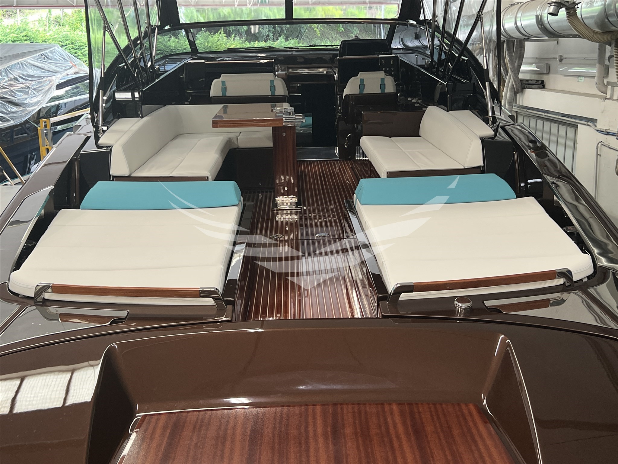 COLORE SCAFO SPECIALE CHOCOLATE BROWN, CUSCINERIE BIANCHE CON DETTAGLI TURCHESI, INTERNI IN MOGANO LUCIDO, QUOIO COLOR TABACCO E LACCATURE BLUE NAVY