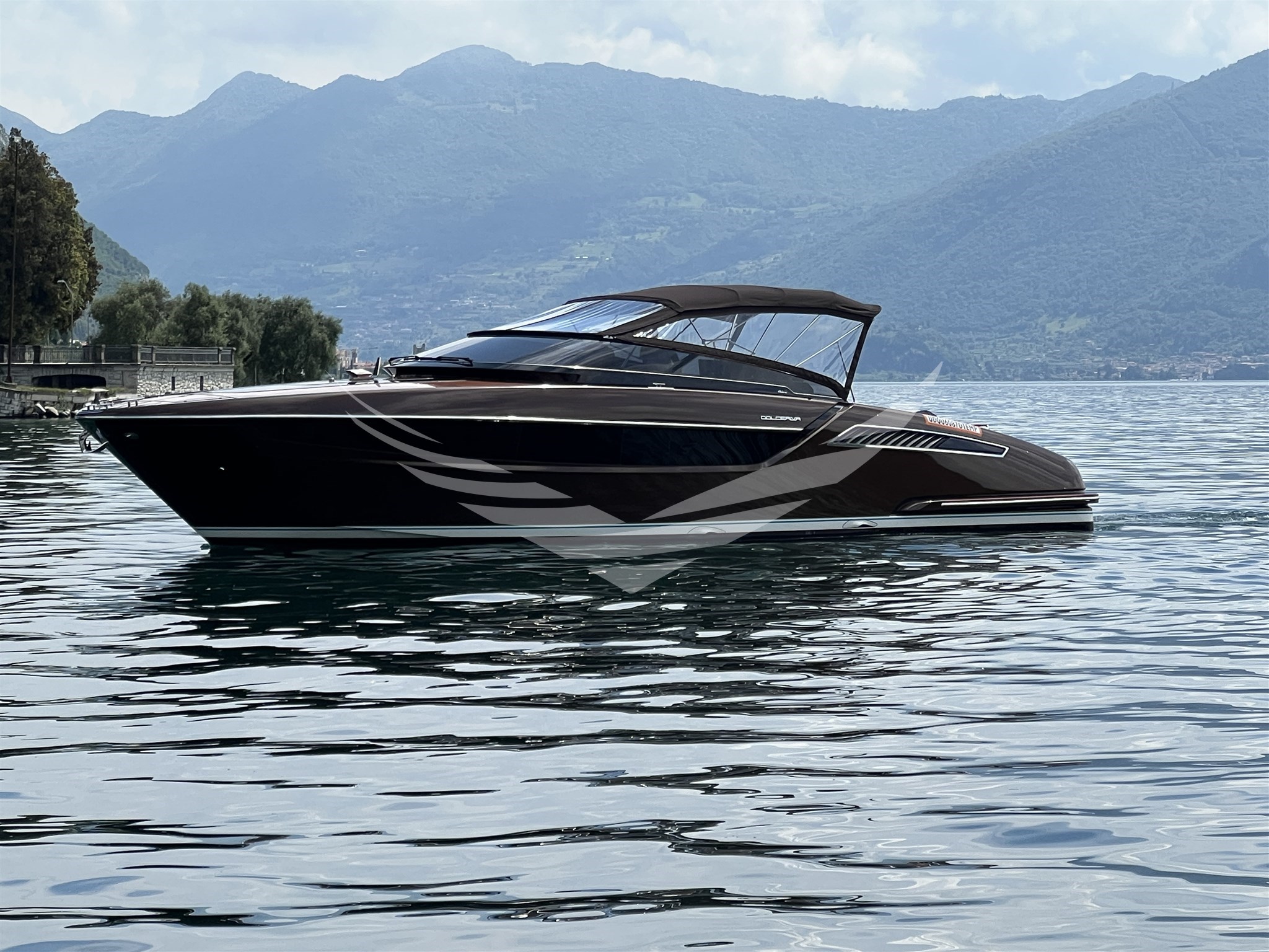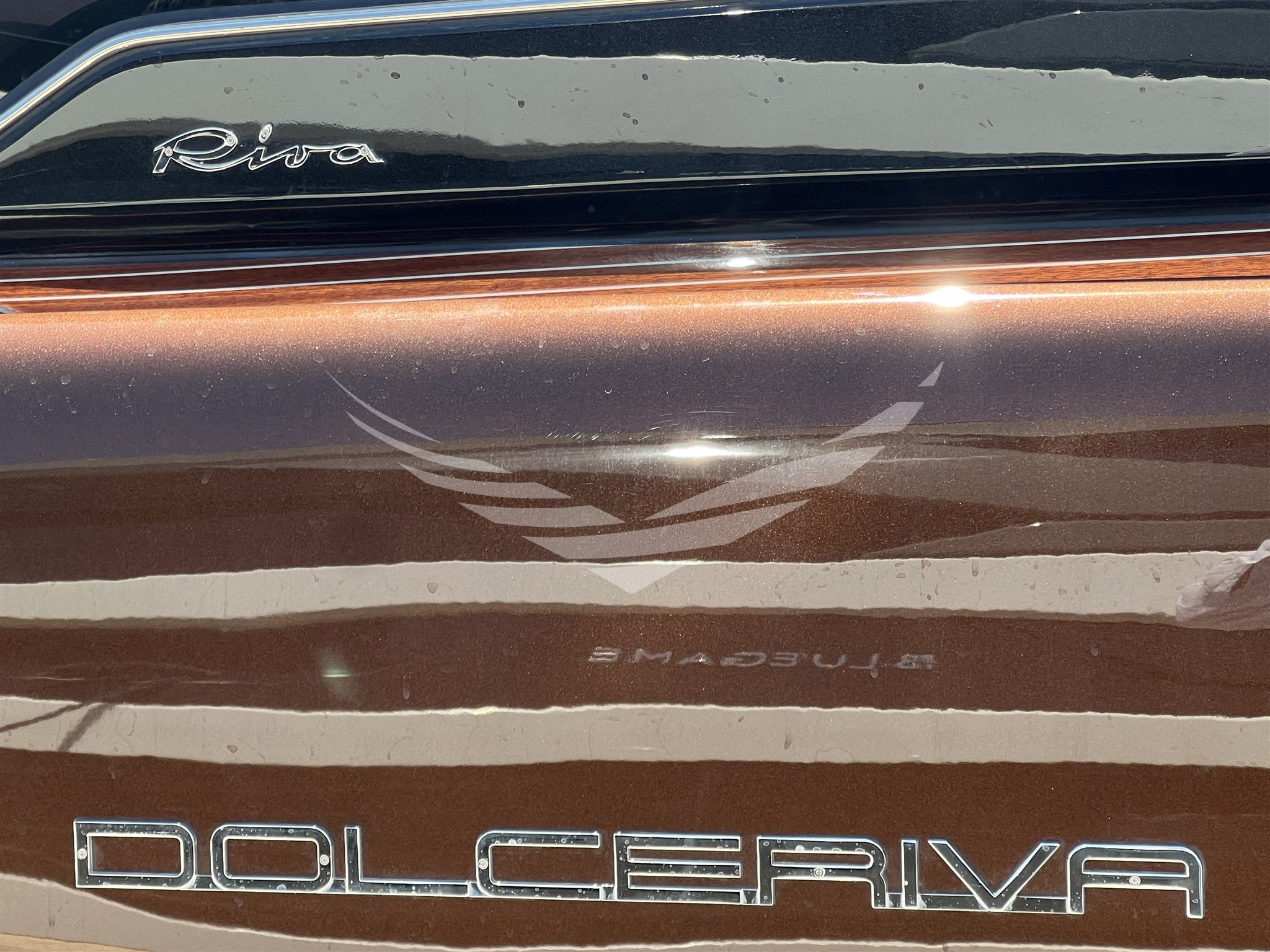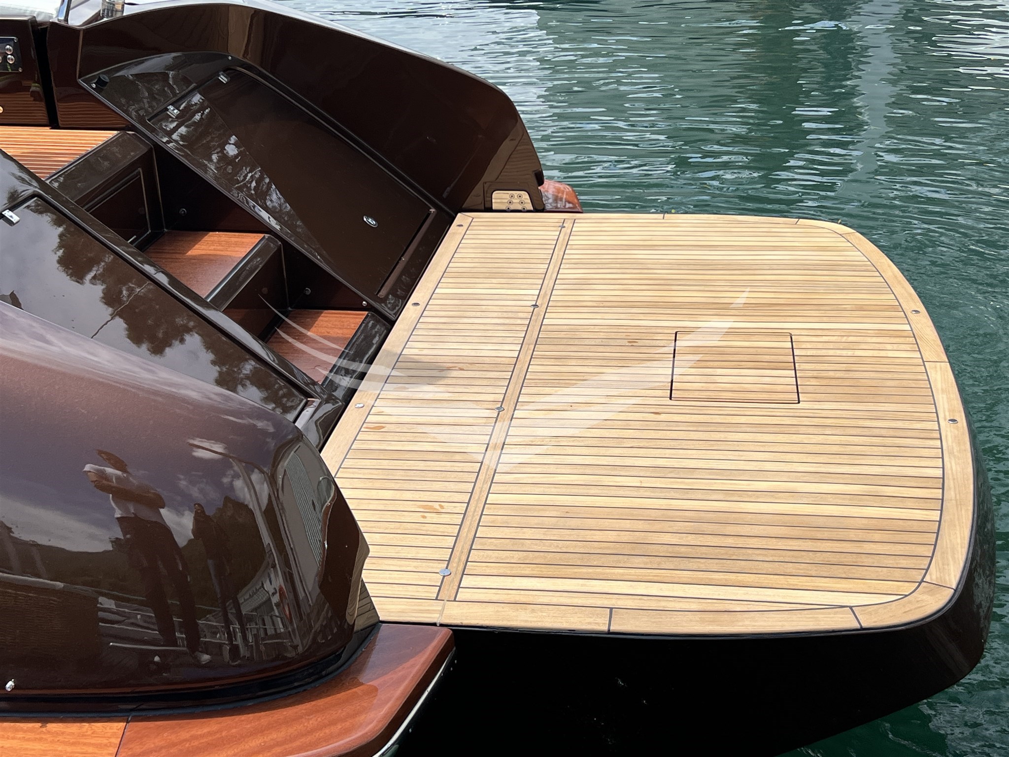 COLORE SCAFO SPECIALE CHOCOLATE BROWN, CUSCINERIE BIANCHE CON DETTAGLI TURCHESI, INTERNI IN MOGANO LUCIDO, QUOIO COLOR TABACCO E LACCATURE BLUE NAVY