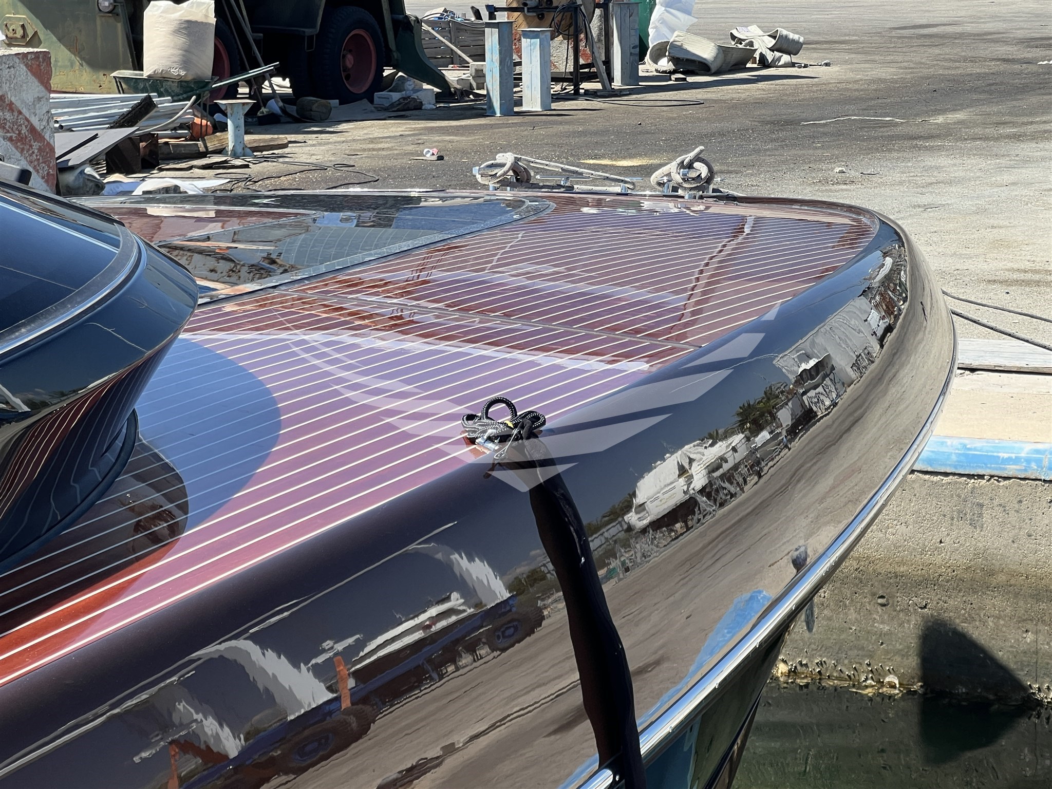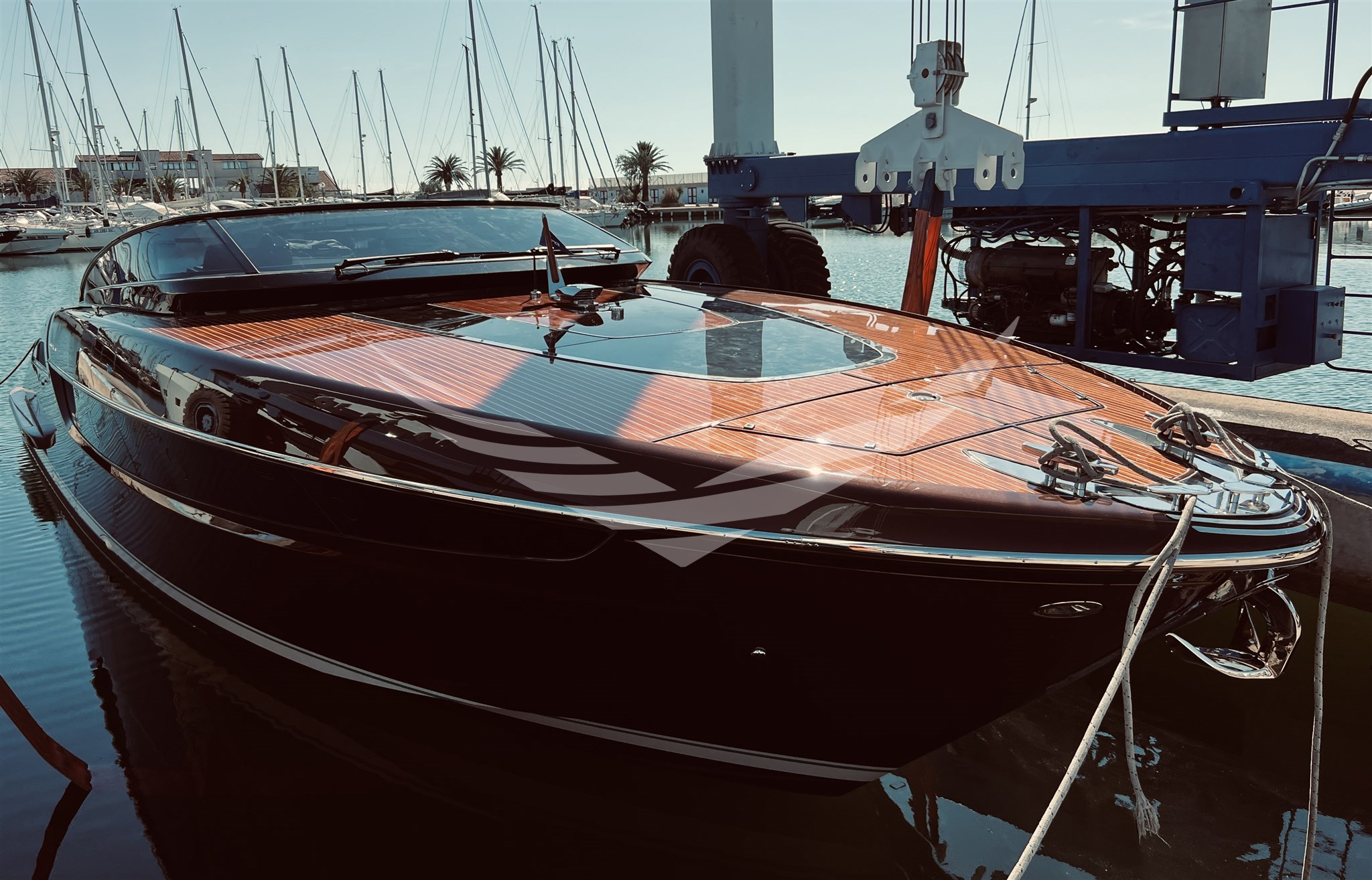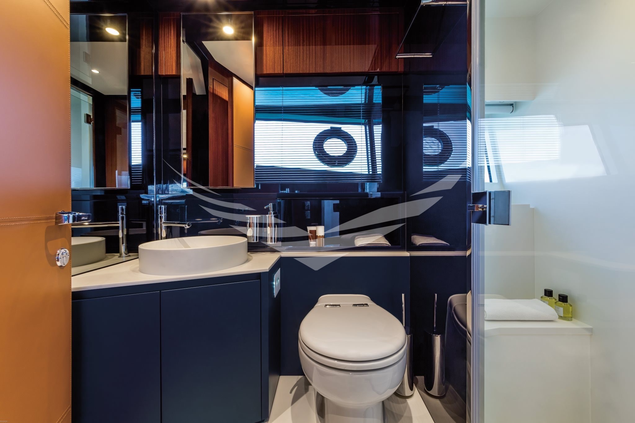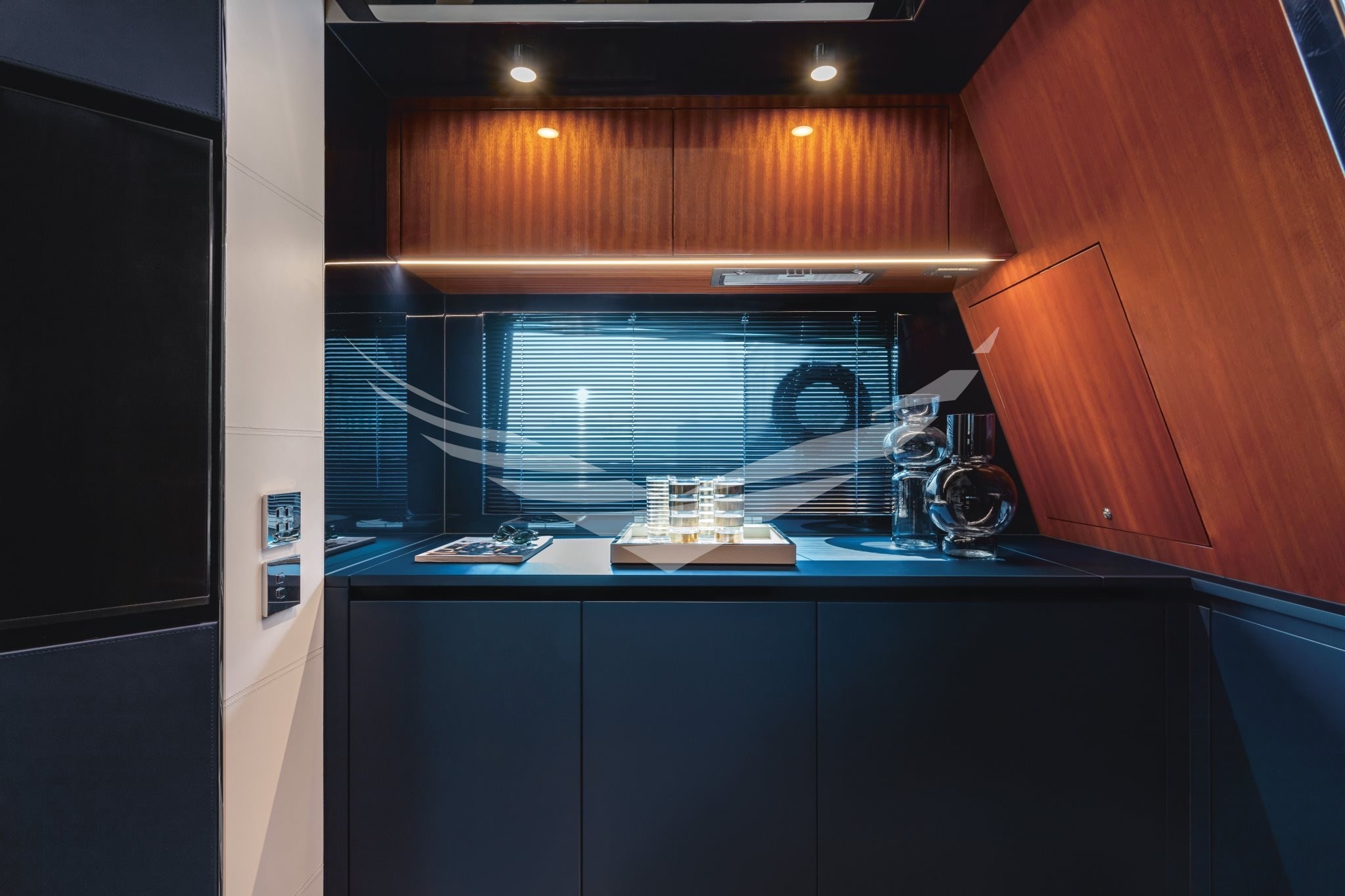 COLORE SCAFO SPECIALE CHOCOLATE BROWN, CUSCINERIE BIANCHE CON DETTAGLI TURCHESI, INTERNI IN MOGANO LUCIDO, QUOIO COLOR TABACCO E LACCATURE BLUE NAVY