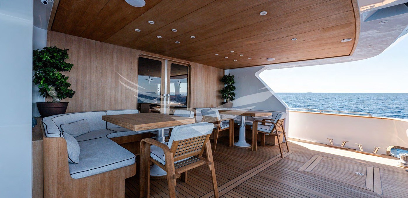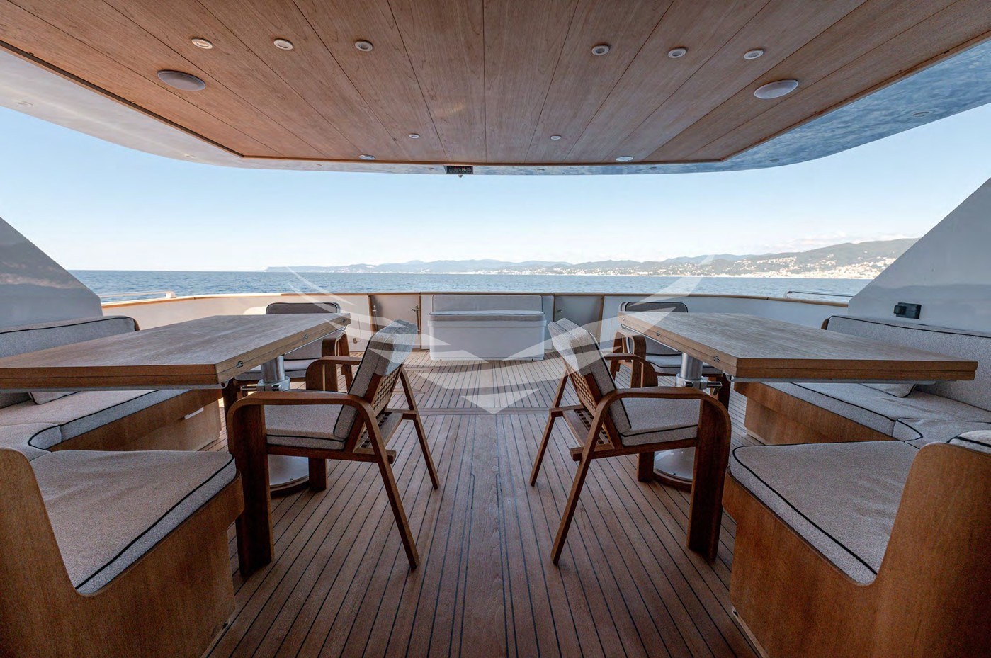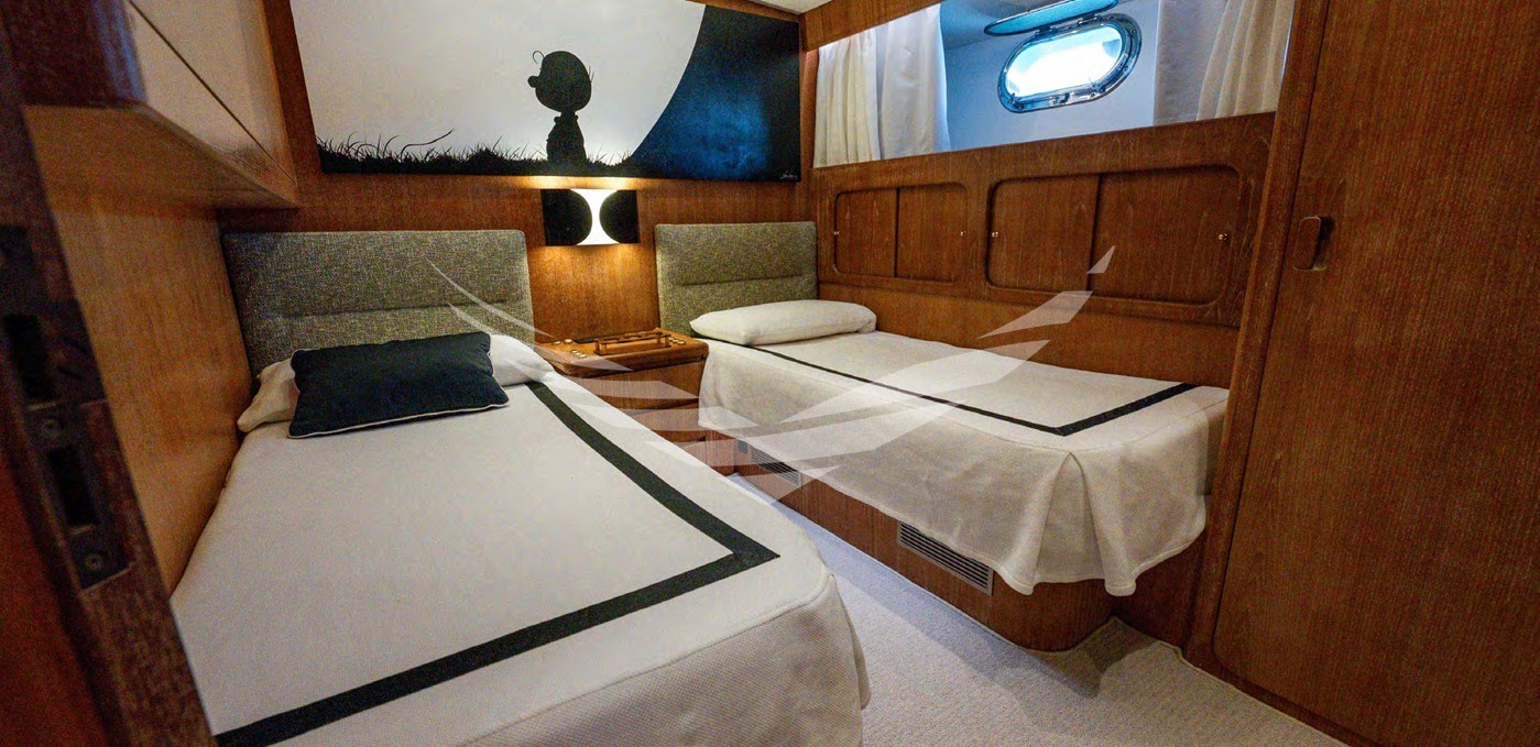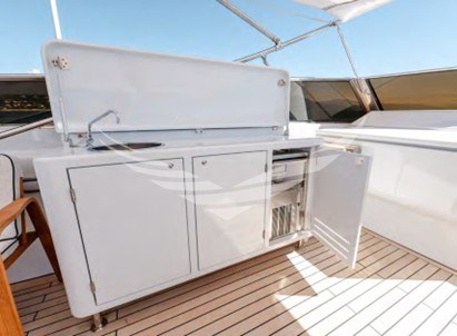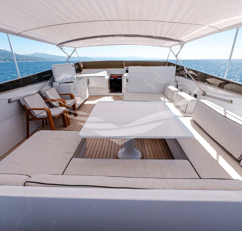 - Calpestio di coperta rivestiti in teak gommato dei camminamenti laterali sino a prua in quanto sostituiti nel 2019; I piani di calpestio del pozzetto, e del fly sostituiti nel 2024 con nuovo piano in doghe di teak massello dello spessore di 12 mm