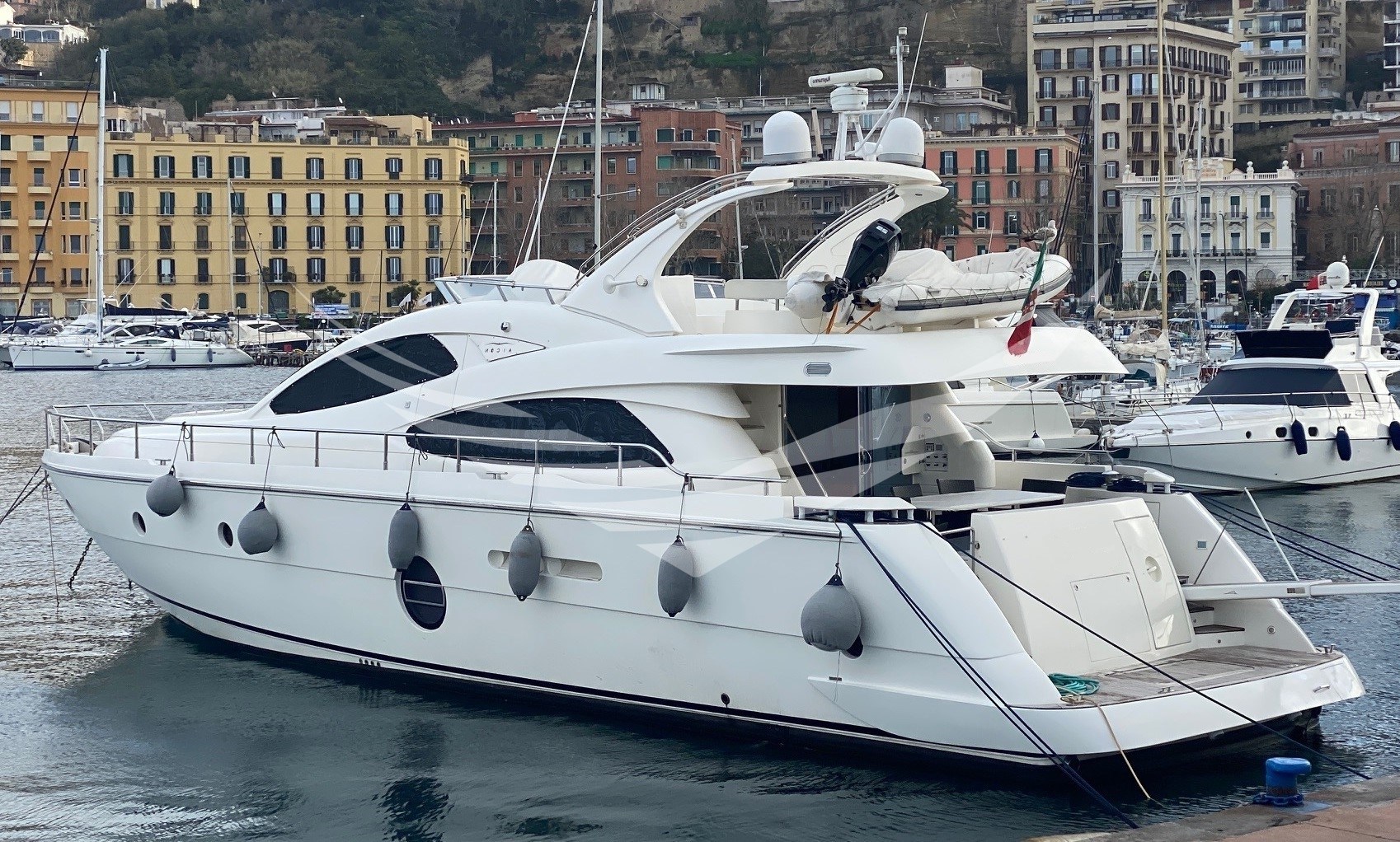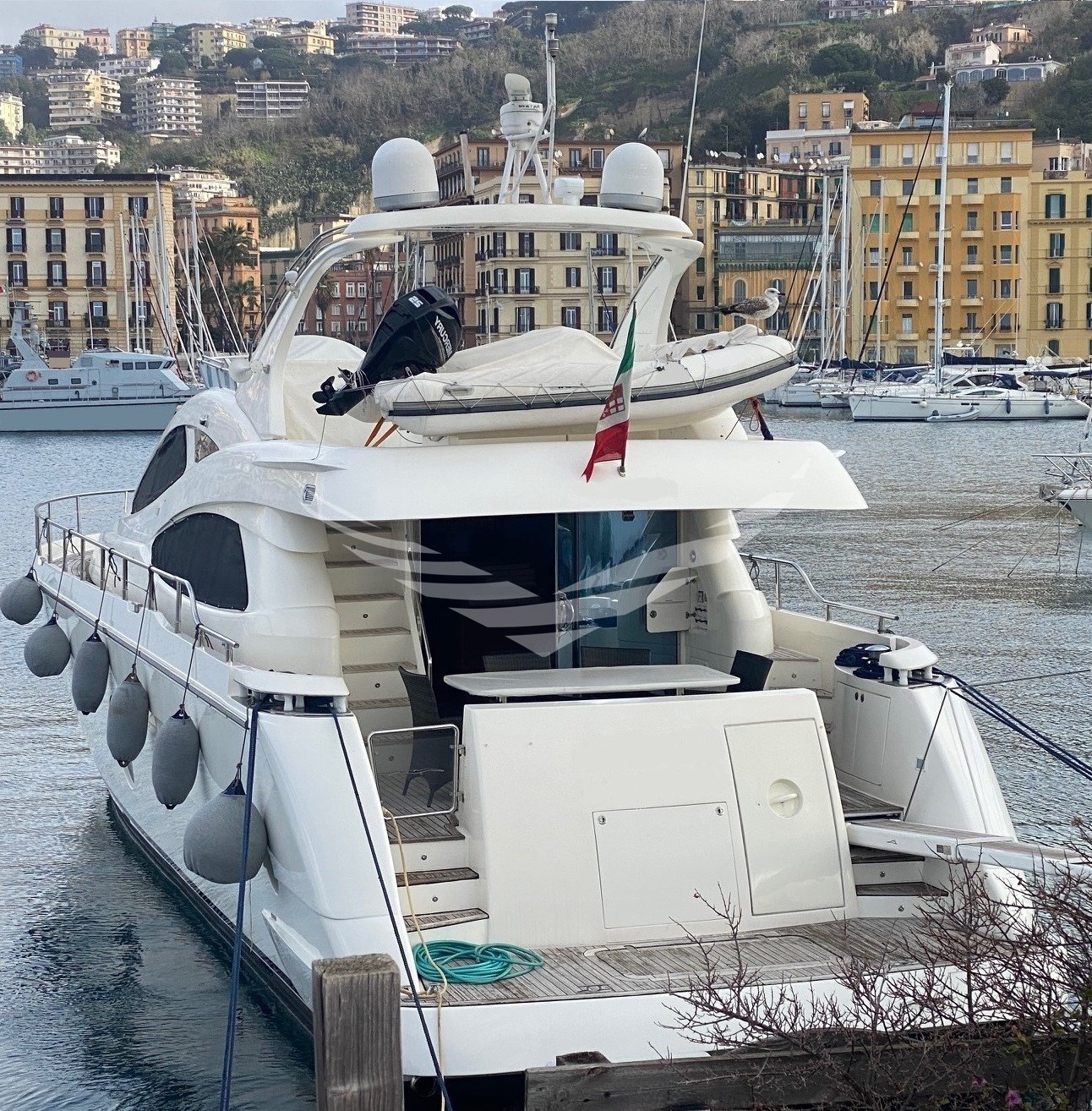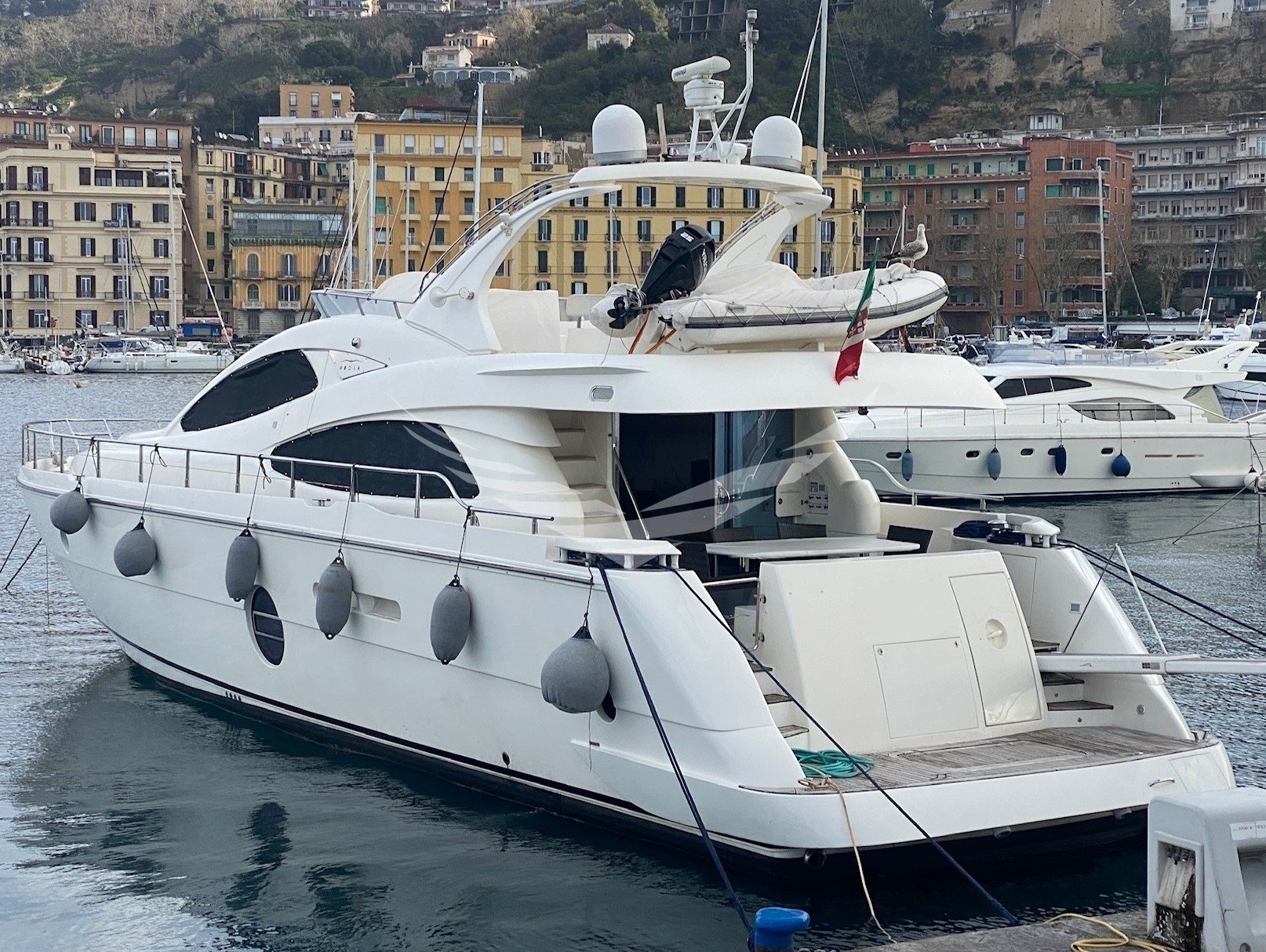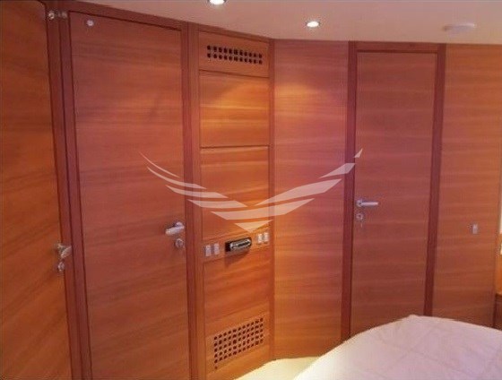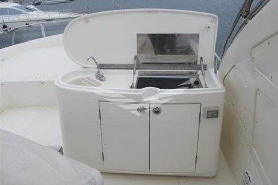 Allarme motore, Allarme sentina, Ancora, Autoclave, Batterie, Camminamenti laterali in teak, Caricabatterie, Doccia esterna, Doppia timoneria, Elica di poppa - stern thruster, Elica di prua - bow thruster, Flap elettrici, Gruette per tender su fly, Impianto antincendio, Luci di cortesia, Passerella, Piattaforma, Pompa di sentina automatica, Pompa di sentina elettrica, Pompa di sentina manuale, Porta ingresso, Porta laterale, Pozzetto Teak, Presa 220V banchina, Raddrizzatore, Rollbar, Salpa Ancore Elettrico, Scaletta da bagno, Tavolo pozzetto, Tientibene con cancelletti, Tromba, Winch tonneggio di poppa.