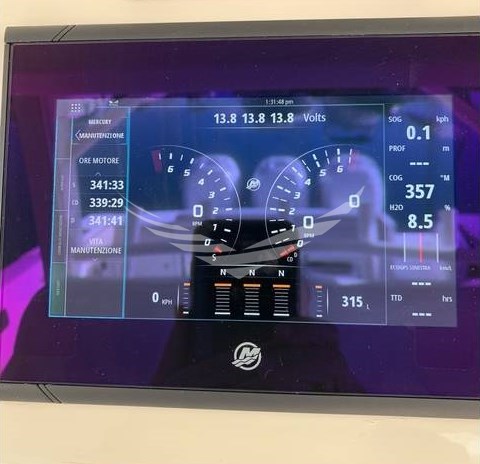 AIS ((Identificazione Raymarine), transceiver 650), Angolo barra, Antenna radar, Bussola, Comando motori elettronico, Computer di bordo, DSC vhf, Ecoscandaglio, GPS, Joystick, Log, Pilota automatico, Plotter, Plotter con antenna GPS, Radar, Radio VHF, Sedile Copilota, Sonar.