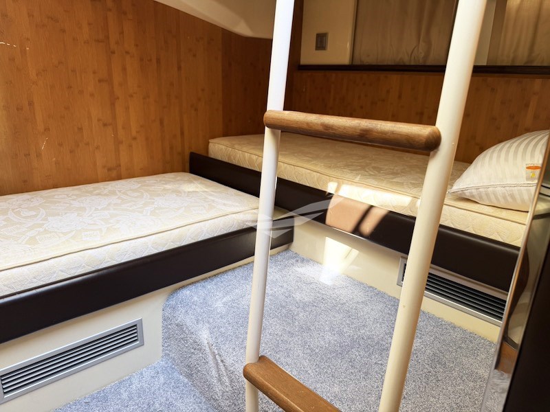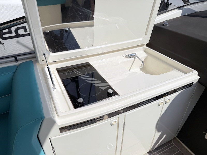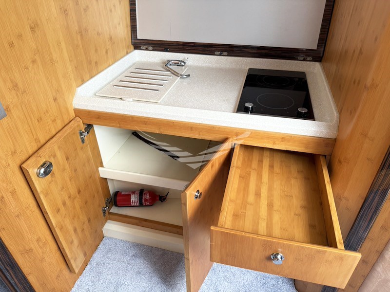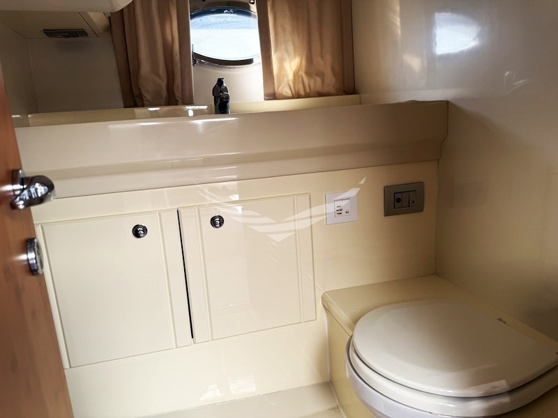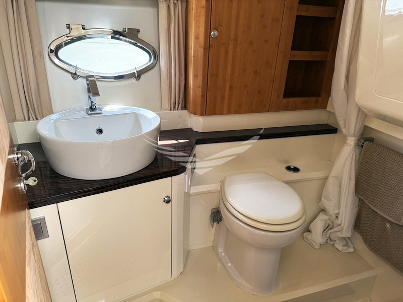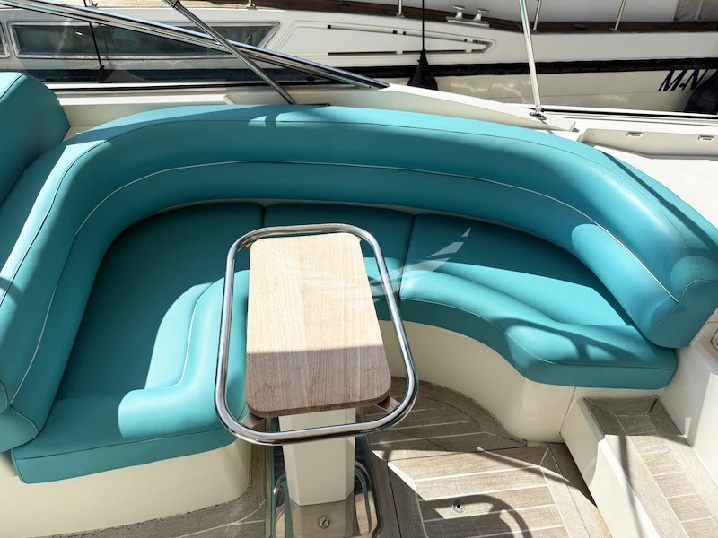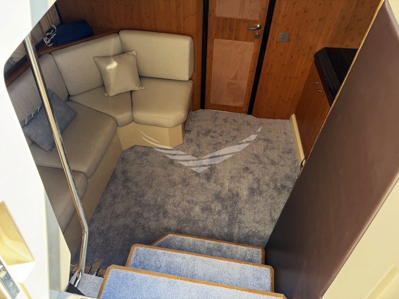 Da poppa, una elegante plancetta rivestita in teak conduce, attraverso 3 comodi grandini, al pozzetto. Questo è caratterizzato dall’ampio prendisole e da due divani a C posti per murata. Proseguendo verso prua vi è la plancia di comando sulla dritta e un largo tambuccio così da rendere più arioso lo spazio interno. Scendendo sottocoperta si trovano la dinette e la cucina. A prua è collocata una grande e confortevole suite armatoriale servita da un bagno con ampia doccia. A poppa, sotto il pozzetto, è ubicata una cabina a due letti per gli ospiti con bagno dedicato
