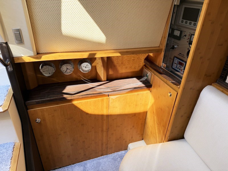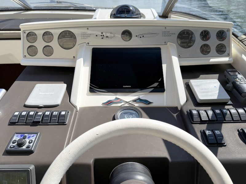 Bussola, Comando motori elettronico, Computer di bordo, Contamiglia, DSC vhf, Ecoscandaglio (e Log (Raymarine), GPS, Joystick (manovra), Luci di navigazione, Pilota automatico (Garmin), Plotter, Plotter con antenna GPS, Radio VHF, Sedile Copilota.