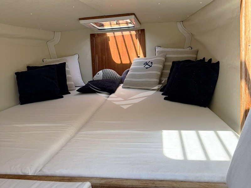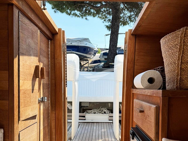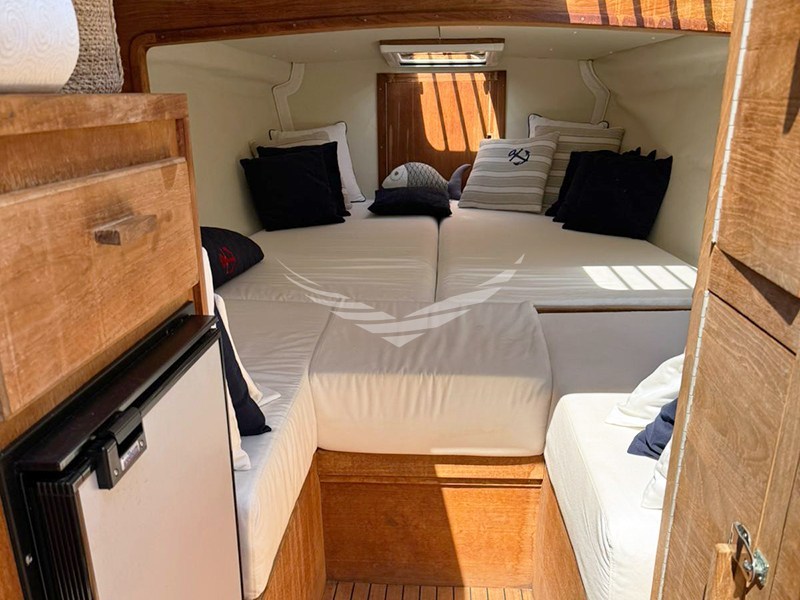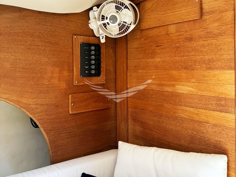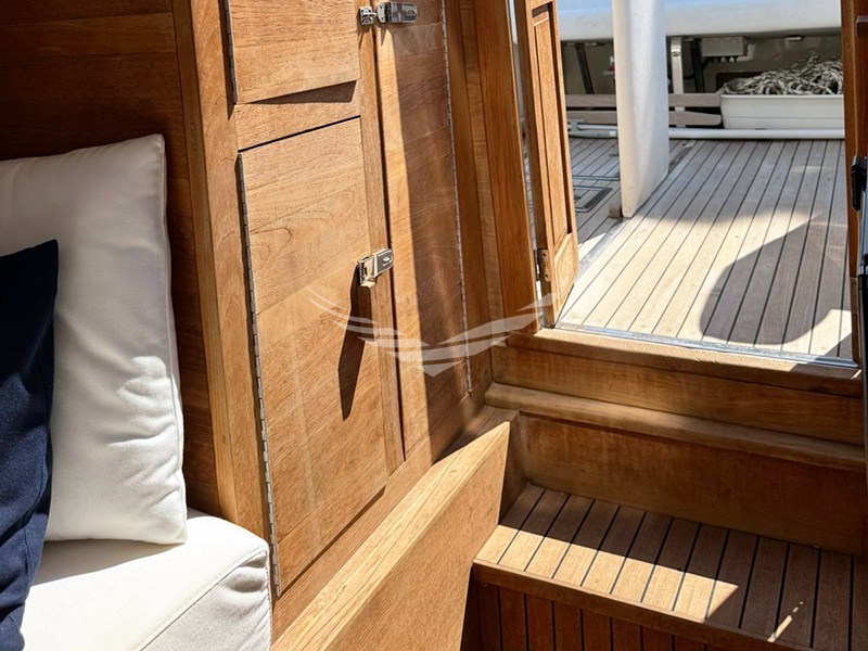 Il tambuccio in legno collega la zona sottocoperta allestita con letto prodiero a V e WC marino a scomparsa. Alla sinistra delle scale di discesa vi è un mobile con frigo interno.