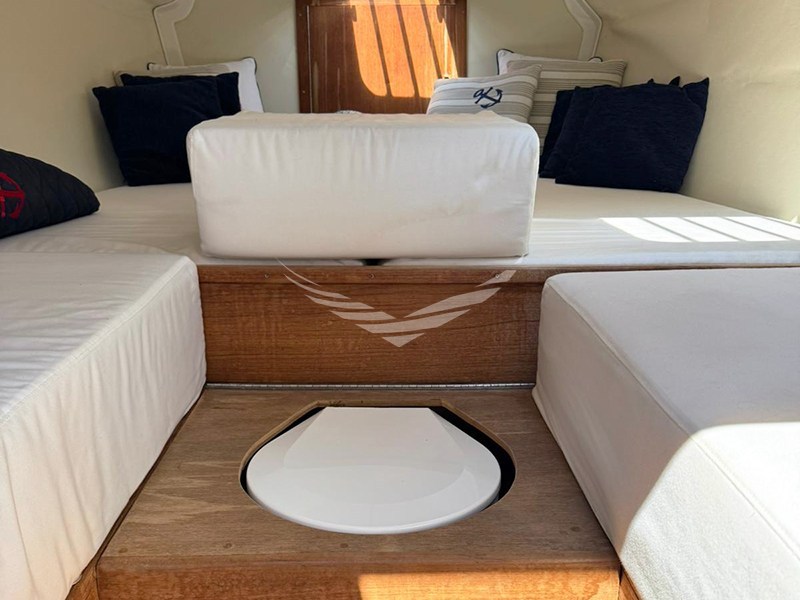 Attraverso la plancetta in teak si accede al prendisole poppiero che nasconde il gavone motore. Il pozzetto è attrezzato divanetto posto per madiere, seduta del pilota lungo la murata di dritta e quella del copilota sul lato opposto.