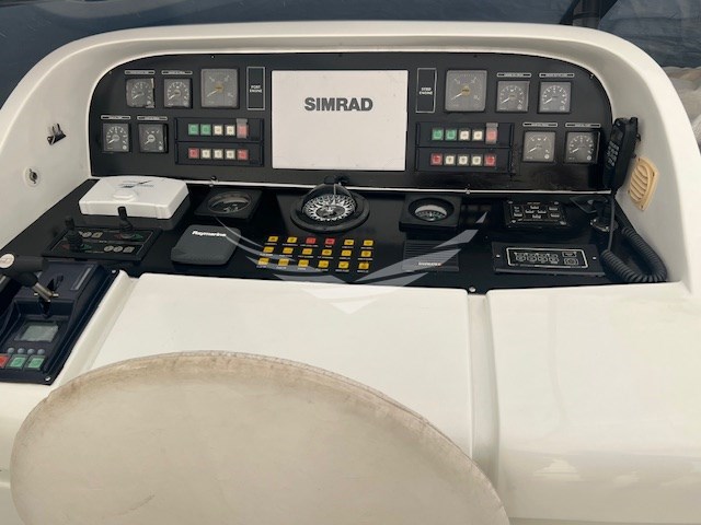 Angolo barra, Bussola, Comando motori elettronico, Contamiglia, DSC vhf, Ecoscandaglio, GPS, Interfono, Log, Luci di navigazione, Pilota automatico (NAVCONTROL), Plotter, Plotter con antenna GPS, Quadro comandi, Radar (SIMRAD), Radio VHF, Sedile Copilota.