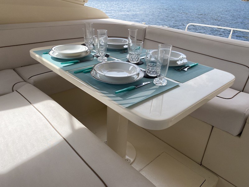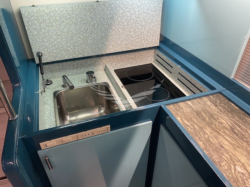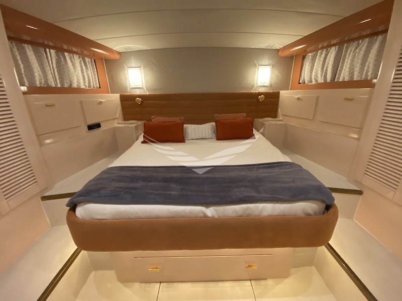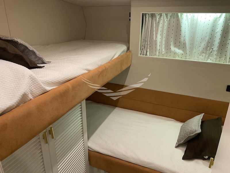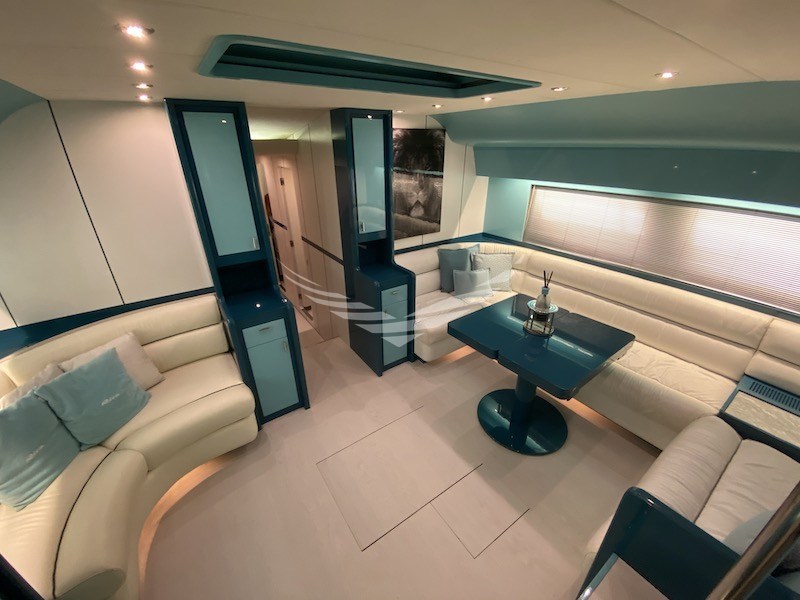 Attraverso la plancetta integrata nello specchio di poppa si accede all’ampio pozzetto composto da comodo prendisole, dinette a C e timonieri sul lato di dritta; mobile bar lungo la murata sinistra. Sottocoperta la dinette è costituita da divano a C servito da attrezzata cucina posta lungo fianco sinistro. Verso prua sono posizionate specularmente le due cabine ospiti con letti a L servite da un bagno. La zona prodiera è riservata alla cabina armatoriale con bagno en-