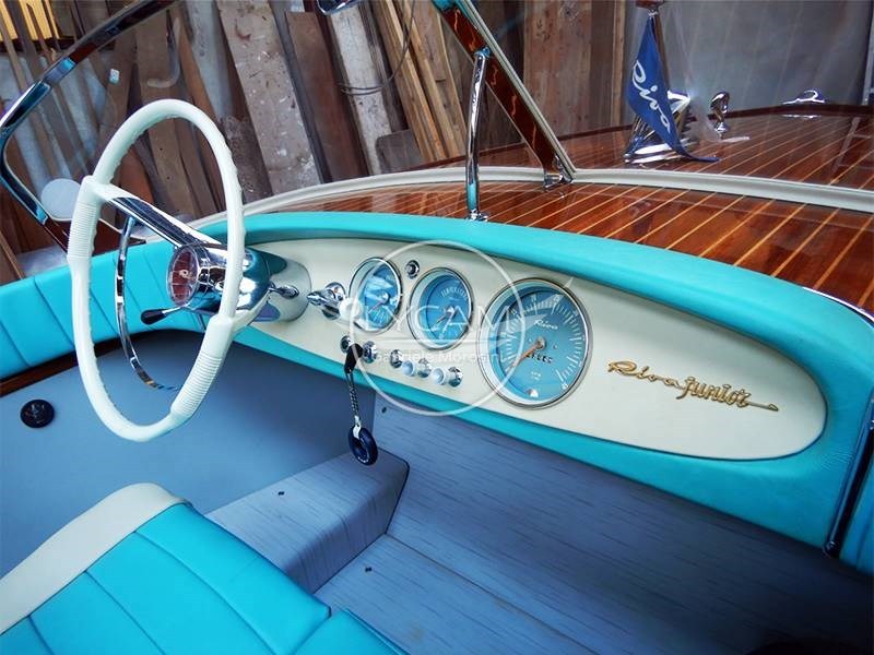 Presentato al Salone di Genova nel 1966 come la “bomba dei giovani”, il Riva Junior costituisce un validissimo esempio di motoscafo versatile in grado di coniugare al meglio l’aspetto familiare a quello ludico legato alla pratica degli sport del mare. L’obiettivo di Carlo Riva è quello di creare una barca facile da condurre e da mantenere così da permettere ai suoi armatori (anche più giovani) di praticare tranquillamente attività come la pesca e lo sci d’acqua assaporando al meglio la vita di mare. Diversi sono gli elementi che rendono unico questo modello a partire dalle murate verniciate a smalto bianco a buccia d’arancia tipiche degli Utility vessel americani degli anni Sessanta. Altro aspetto singolare è la forma della poppa che, anziché essere a botte come i classici runabout Riva, presenta un aggetto verso l’esterno così da proteggere i passeggeri dagli spruzzi del mare nelle andature portanti. Un’ulteriore particolarità sono le bitte che, invece di essere delle tradizionali gallocce, sono a forma di anello per rendere più facili eventuali operazioni di alaggio/varo. Come tutti i motoscafi Riva, pure lo Junior ha annoverato importanti armatori del jet set internazionale tra cui Brigitte Bardot, Liz Taylor e Richard Burton.