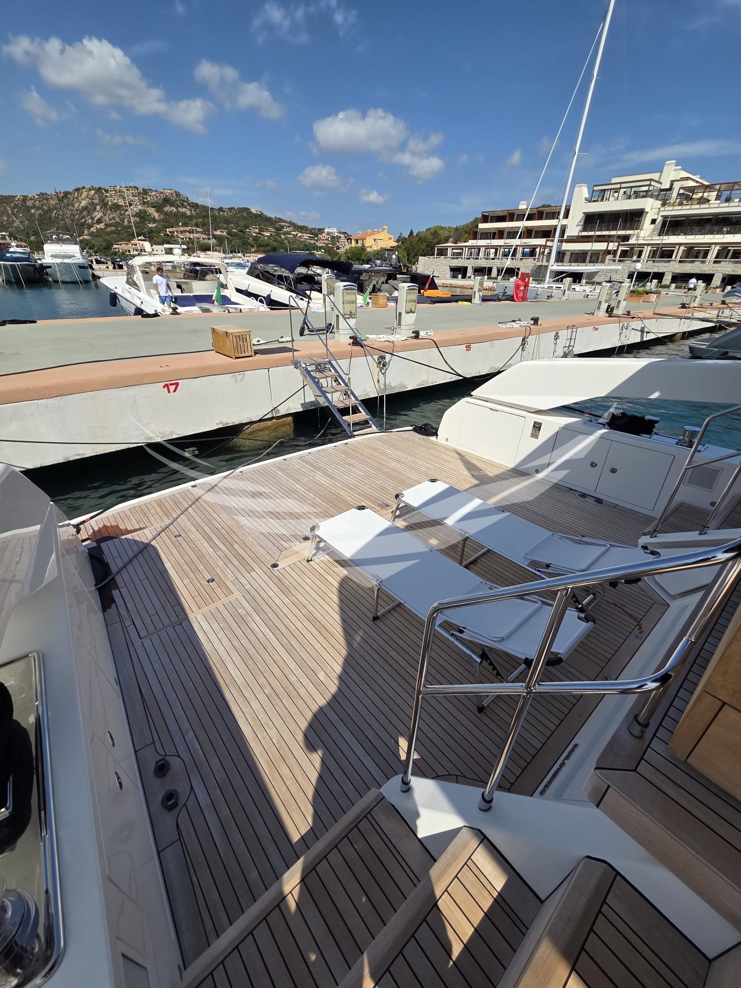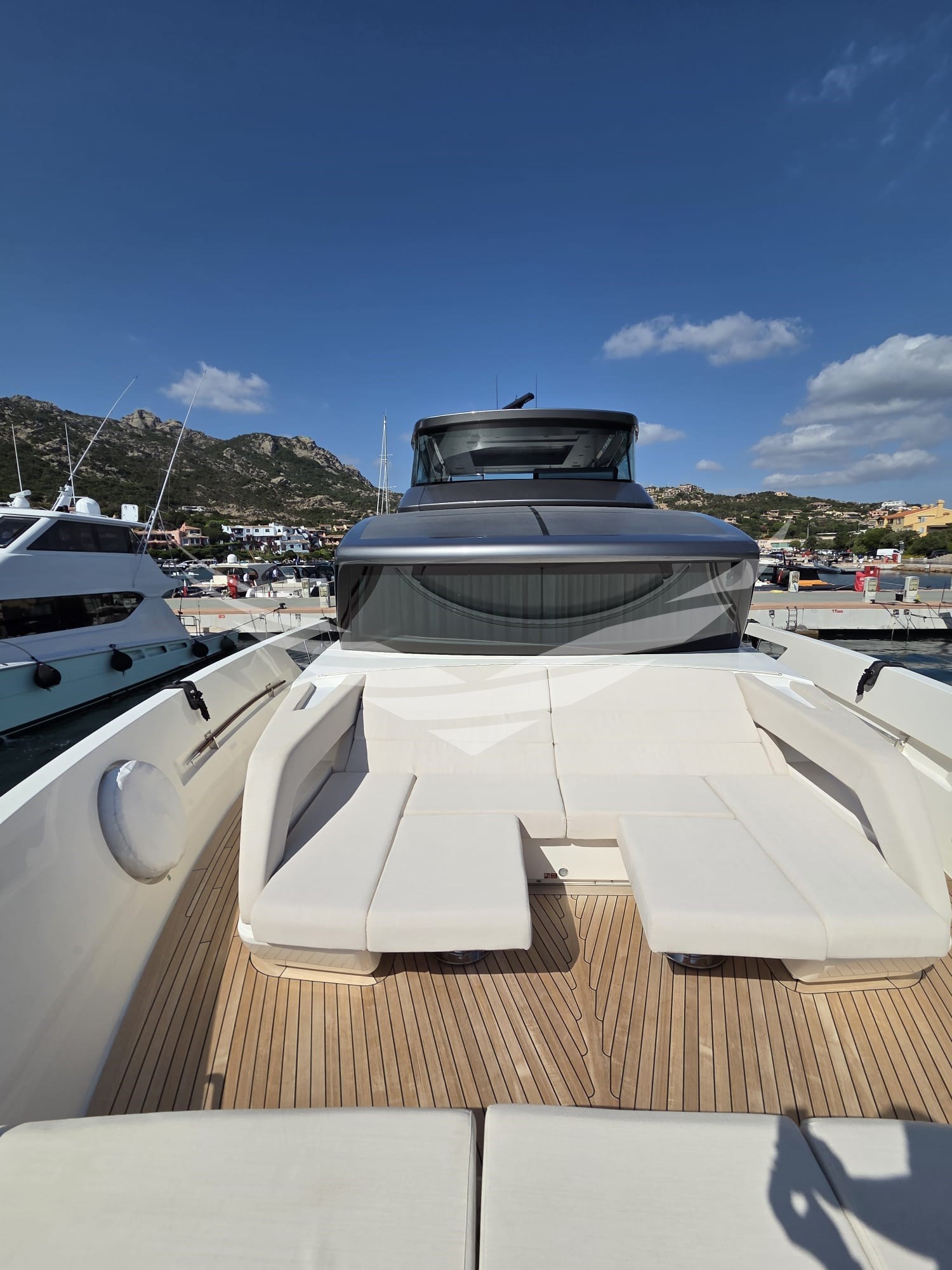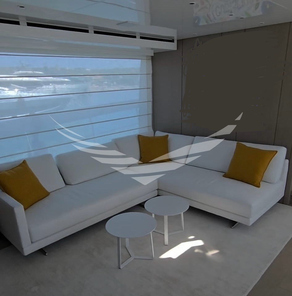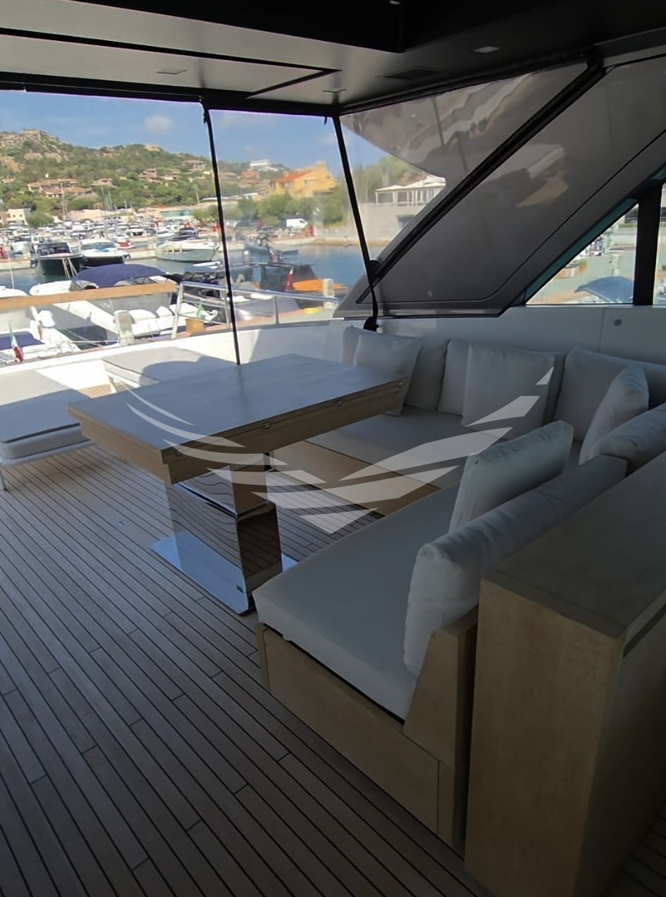 Allarme fumo/gas, Allarme motore, Allarme sentina, Ancora, Autoclave, Autogonfiabile, Batterie, Bocche di Lupa, Camminamenti laterali in teak, Caricabatterie, Colorazione speciale, Doccia esterna, Elica di prua - bow thruster, Faro orientabile, Flap idraulici, Gruette per moto d'acqua, Gruette per tender, Hard top, Impianto antincendio, Indicatori Flaps, Lavaggio catena, Luci di cortesia, Luci subacquee, Passerella (IDRAULICA MULTIFUNZIONE), Piattaforma (ELETTROIDRAULICA), Pompa di sentina automatica, Pompa di sentina elettrica, Pompa di sentina manuale, Porta ingresso, Porta laterale, Pozzetto Teak, Presa 220V banchina, Presa acqua banchina, Raddrizzatore, Salpa Ancore Idraulico, Scaletta da bagno, Stabilizzatori (PINNE STABILIZZATRICI "ZERO" SPEED), Tavolo pozzetto, Tender (WILLIAMS 345 SPORTJET), Tientibene con cancelletti, Tromba, Winch, Winch Idraulico.