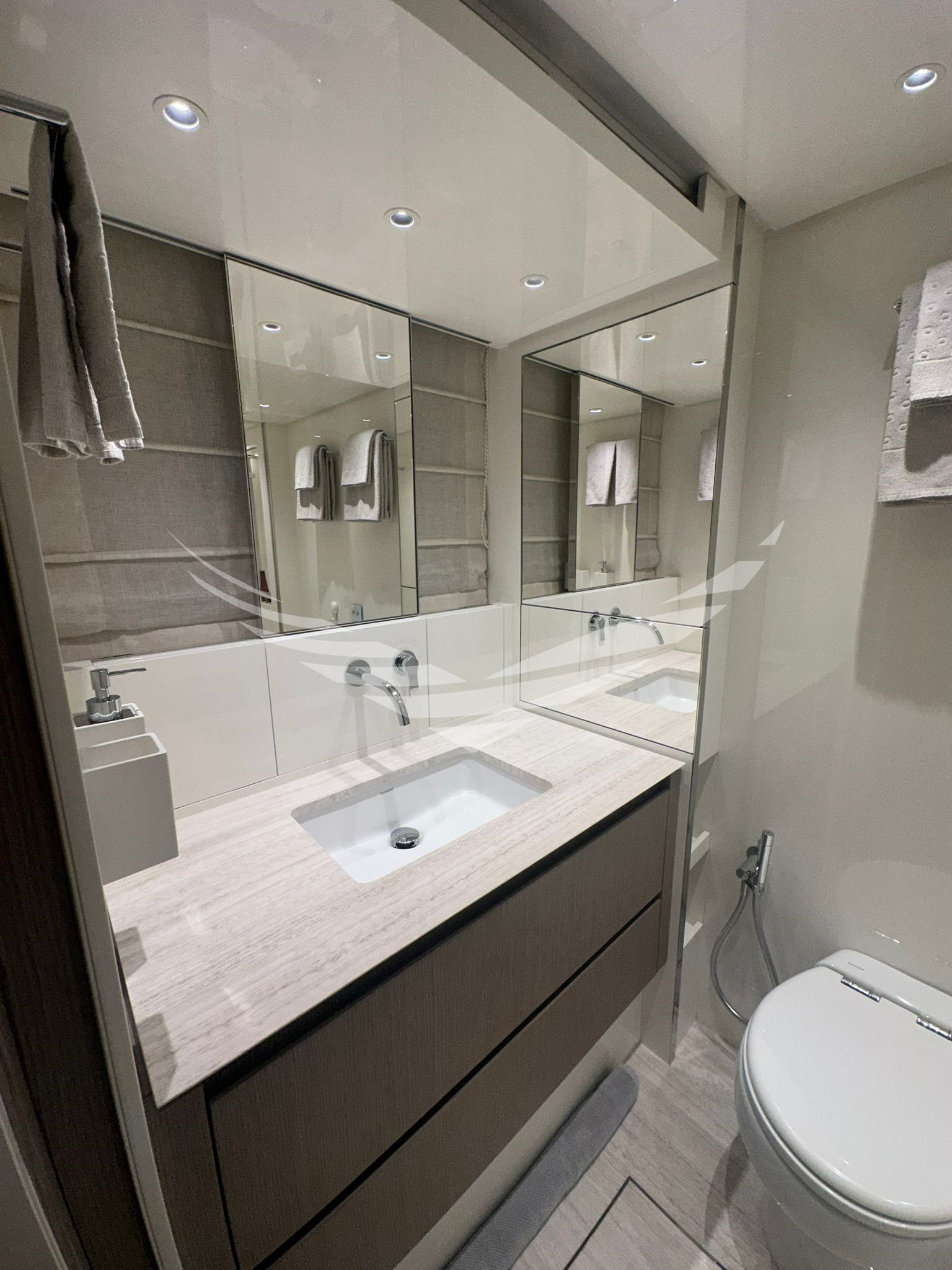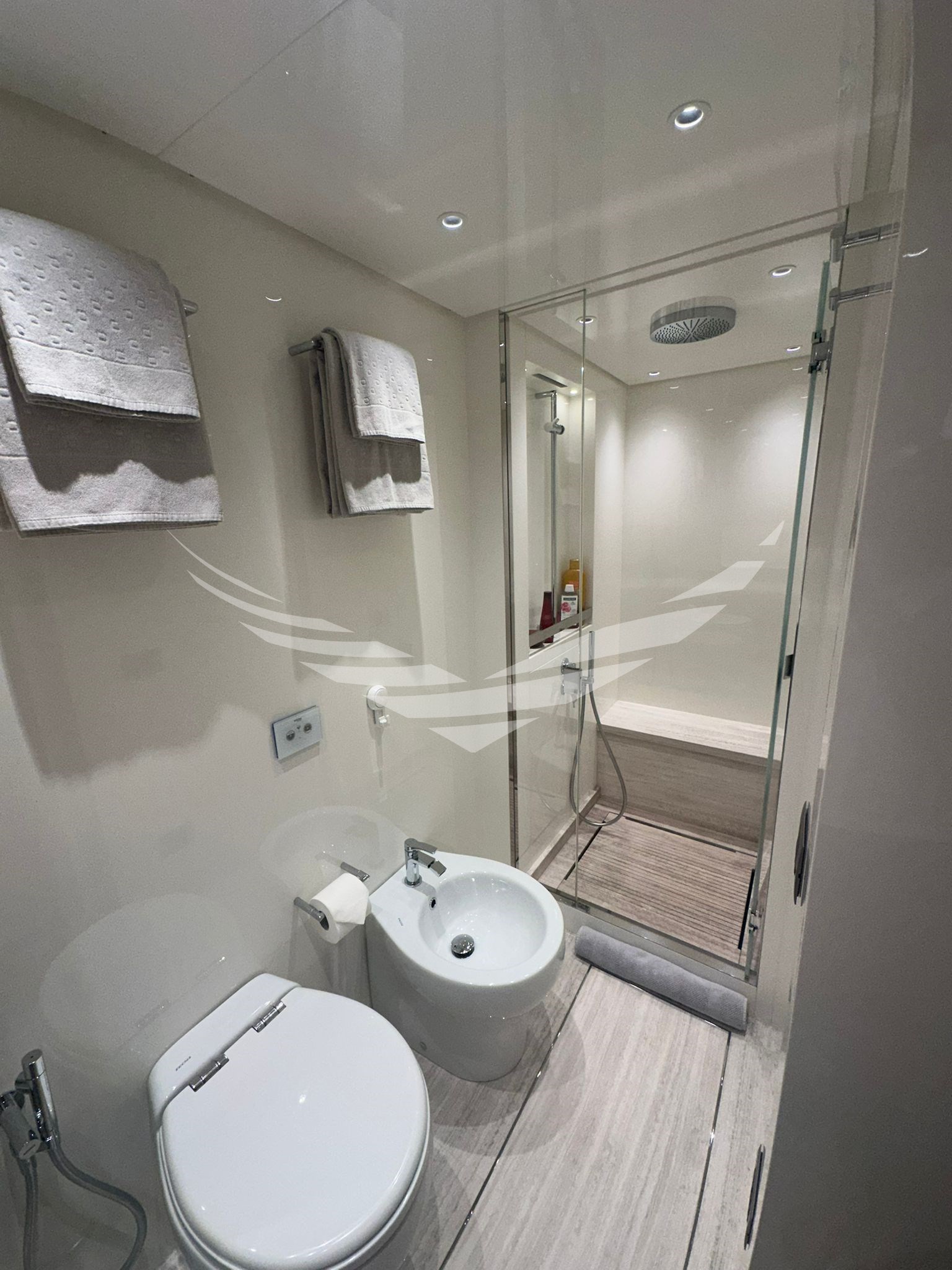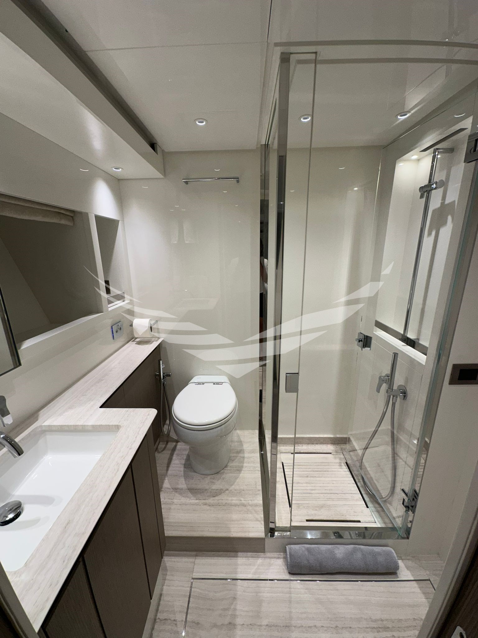 Allarme fumo/gas, Allarme motore, Allarme sentina, Ancora, Autoclave, Autogonfiabile, Batterie, Bocche di Lupa, Camminamenti laterali in teak, Caricabatterie, Colorazione speciale, Doccia esterna, Elica di prua - bow thruster, Faro orientabile, Flap idraulici, Gruette per moto d'acqua, Gruette per tender, Hard top, Impianto antincendio, Indicatori Flaps, Lavaggio catena, Luci di cortesia, Luci subacquee, Passerella (IDRAULICA MULTIFUNZIONE), Piattaforma (ELETTROIDRAULICA), Pompa di sentina automatica, Pompa di sentina elettrica, Pompa di sentina manuale, Porta ingresso, Porta laterale, Pozzetto Teak, Presa 220V banchina, Presa acqua banchina, Raddrizzatore, Salpa Ancore Idraulico, Scaletta da bagno, Stabilizzatori (PINNE STABILIZZATRICI "ZERO" SPEED), Tavolo pozzetto, Tender (WILLIAMS 345 SPORTJET), Tientibene con cancelletti, Tromba, Winch, Winch Idraulico.