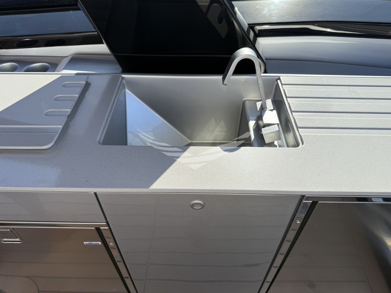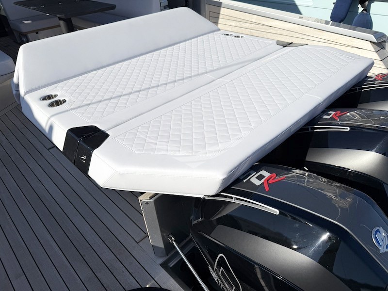 Attraverso la piccola ma funzionale plancetta di poppa dotata di passerella idraulica s’accede all’ampio e pratico pozzetto walkaround. Nella zona poppiera, davanti i motori fuoribordo è stato collocato in posizione centrale il comodo prendisole. Caratteristica di quest’area sono le murate abbattibili che permettono un contatto diretto con il mare.